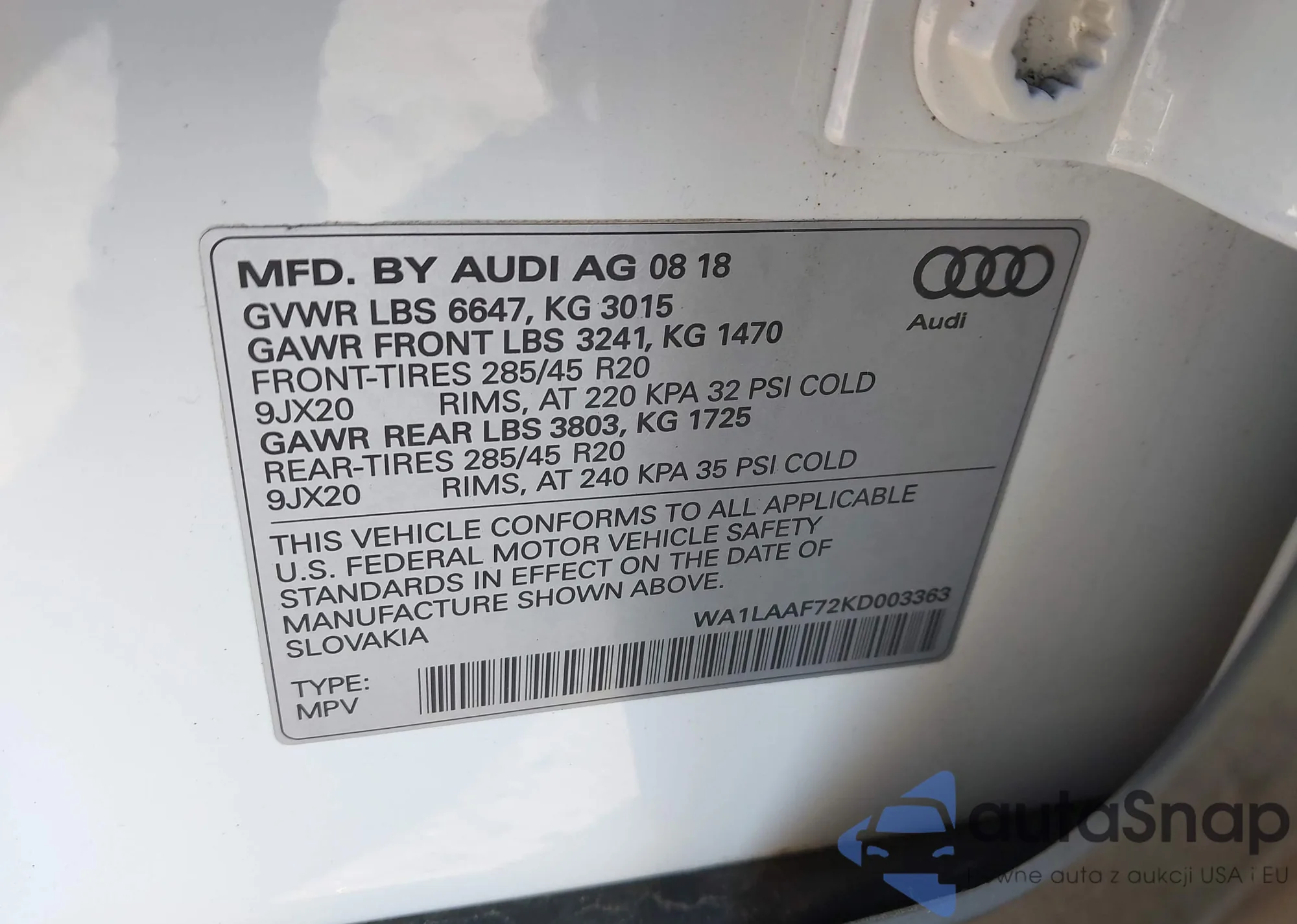LOT: 44179191 VIN: WA1VAAF72JD028383