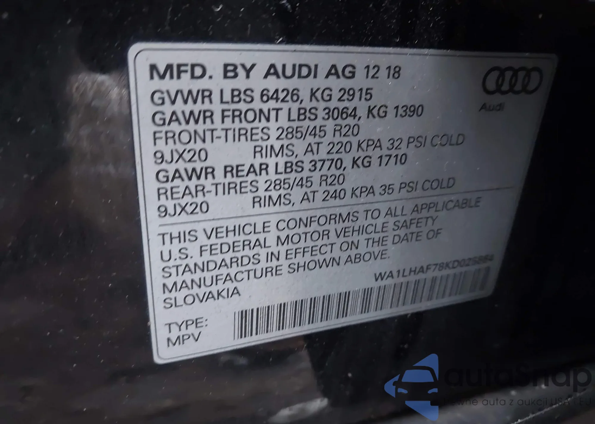 LOT: 44351475 VIN: WA1VAAF78KD049384