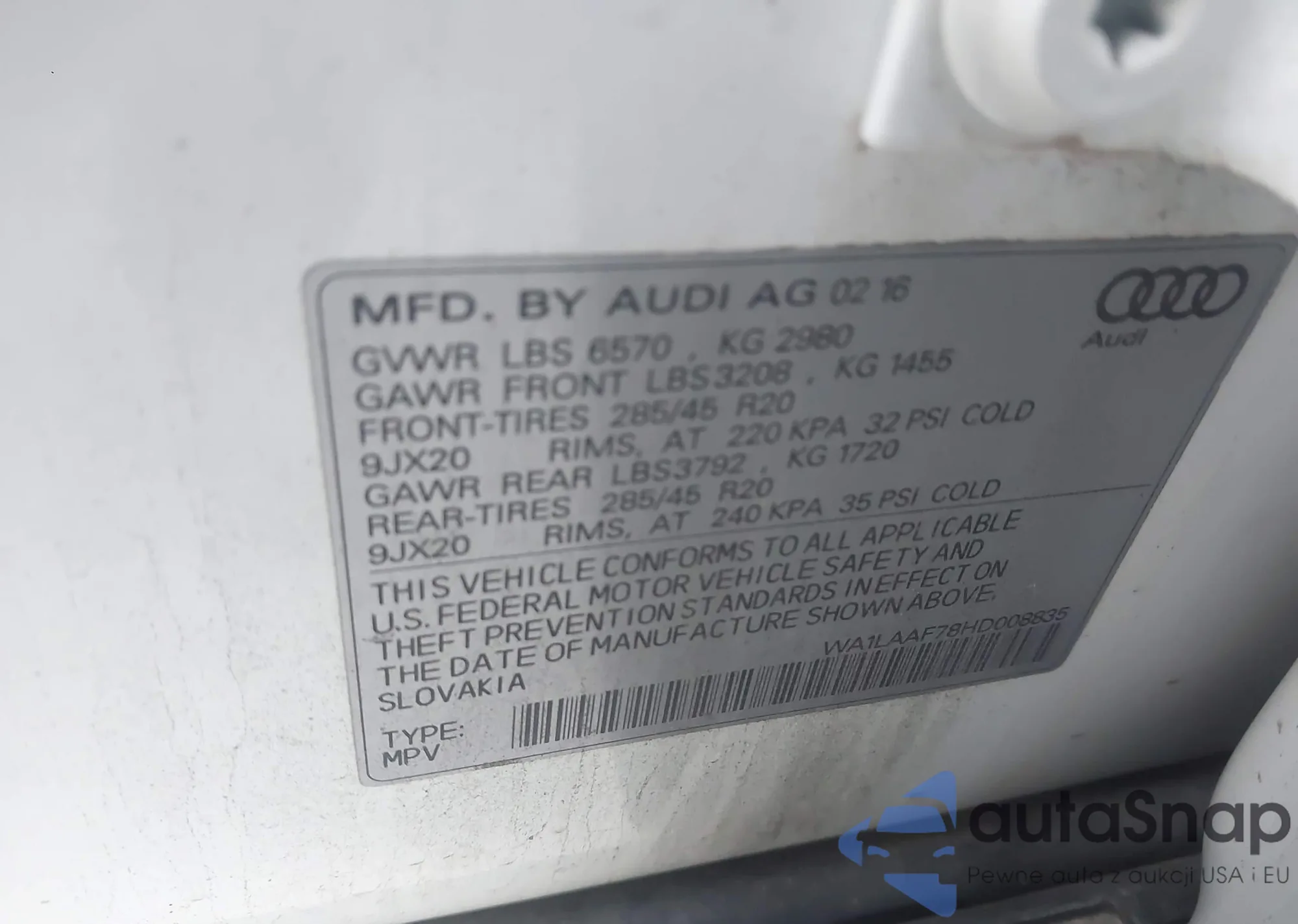 LOT: 44510392 VIN: WA1LAAF78HD008835
