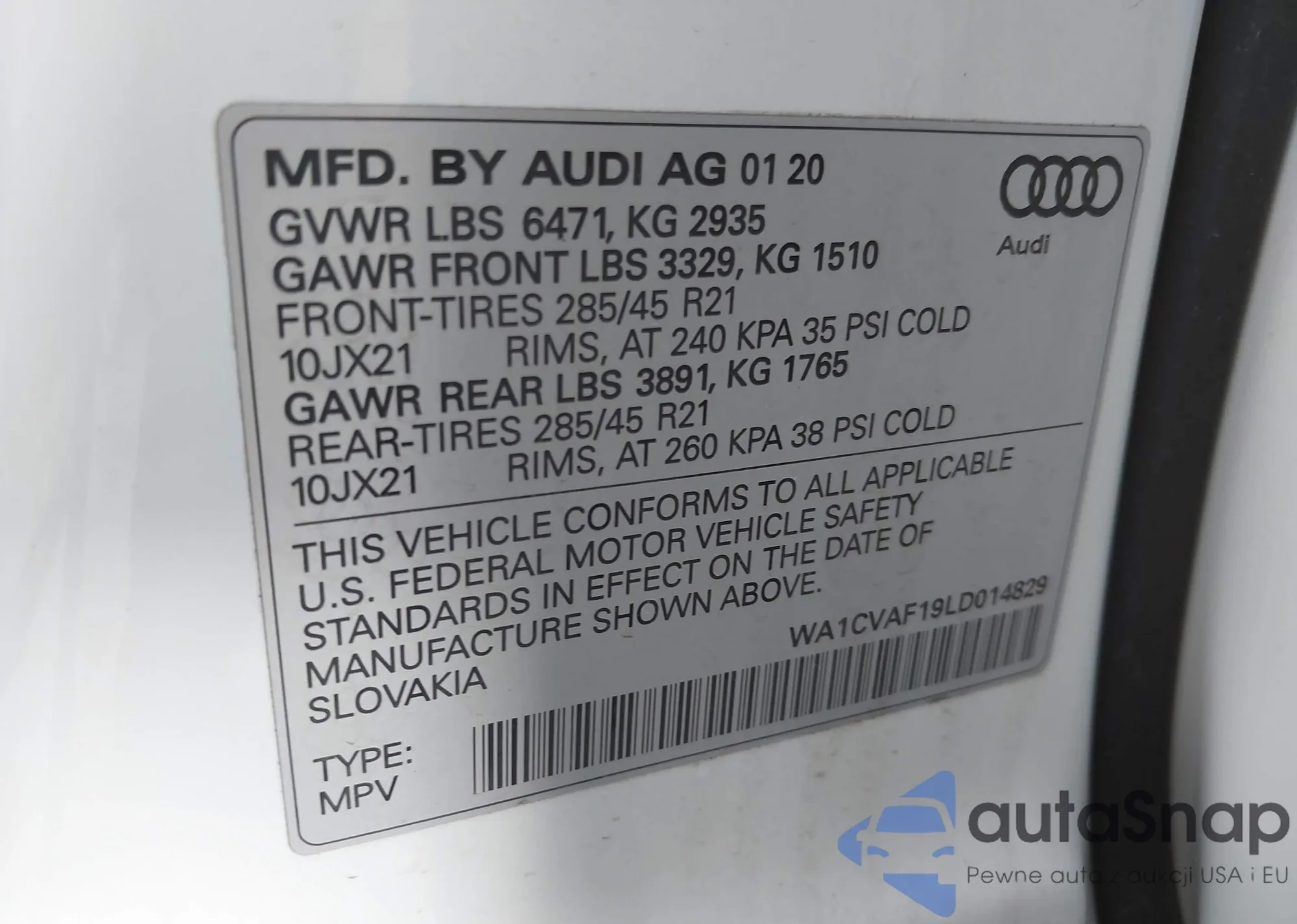 LOT: 44492199 VIN: WA1CVAF19LD014829