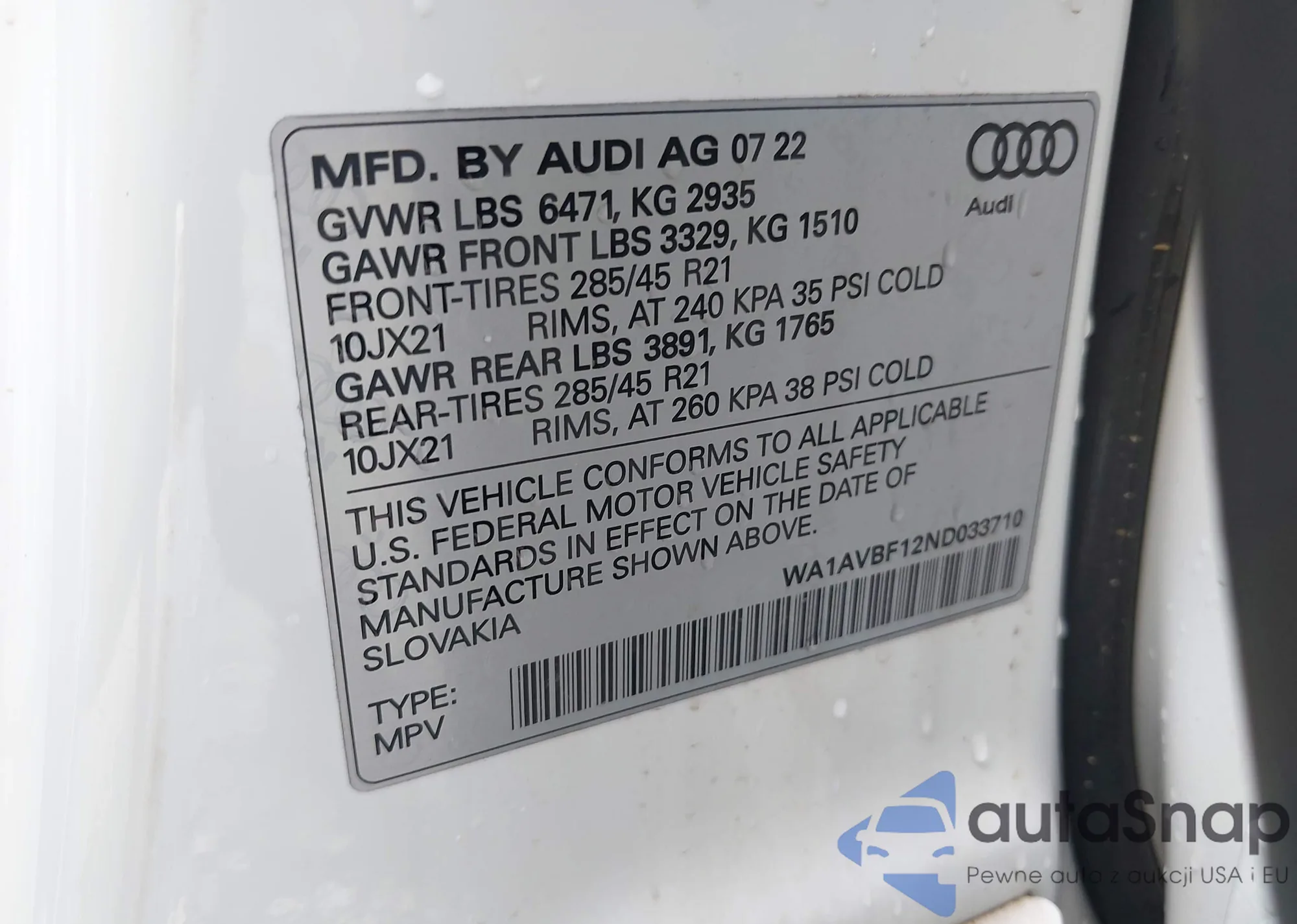 LOT: 43400853 VIN: WA1AVBF12ND033710