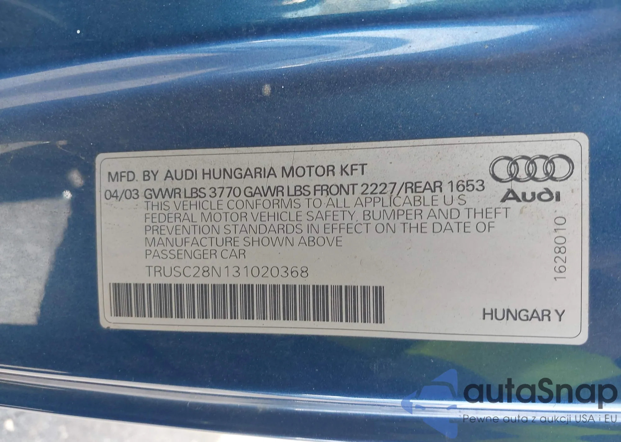 2003 Audi Tt 1.8L z USA, uszkodzony, nr VIN TRUUT28N431015447