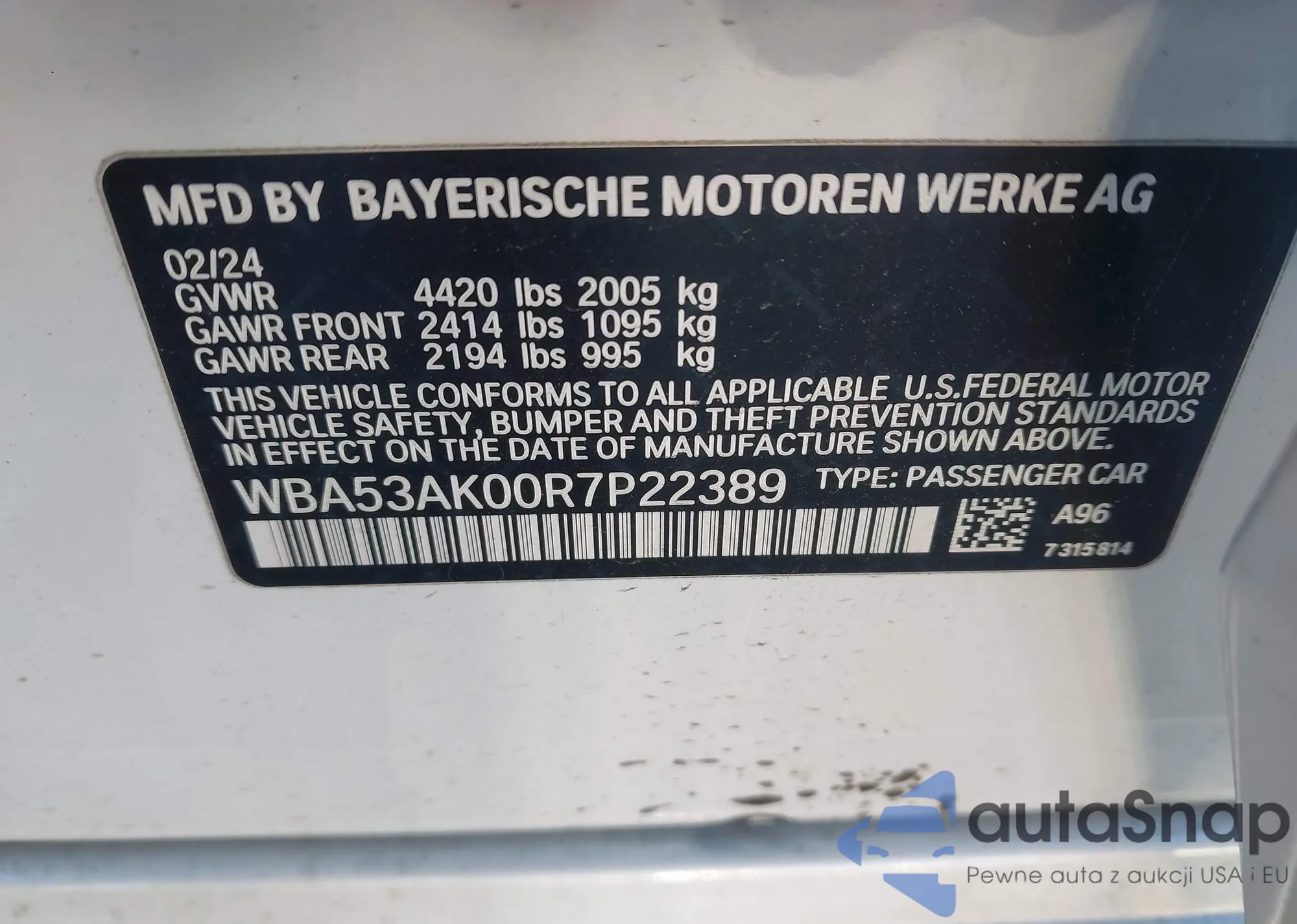 LOT: 44177794 VIN: WBA53AK00R7P22389