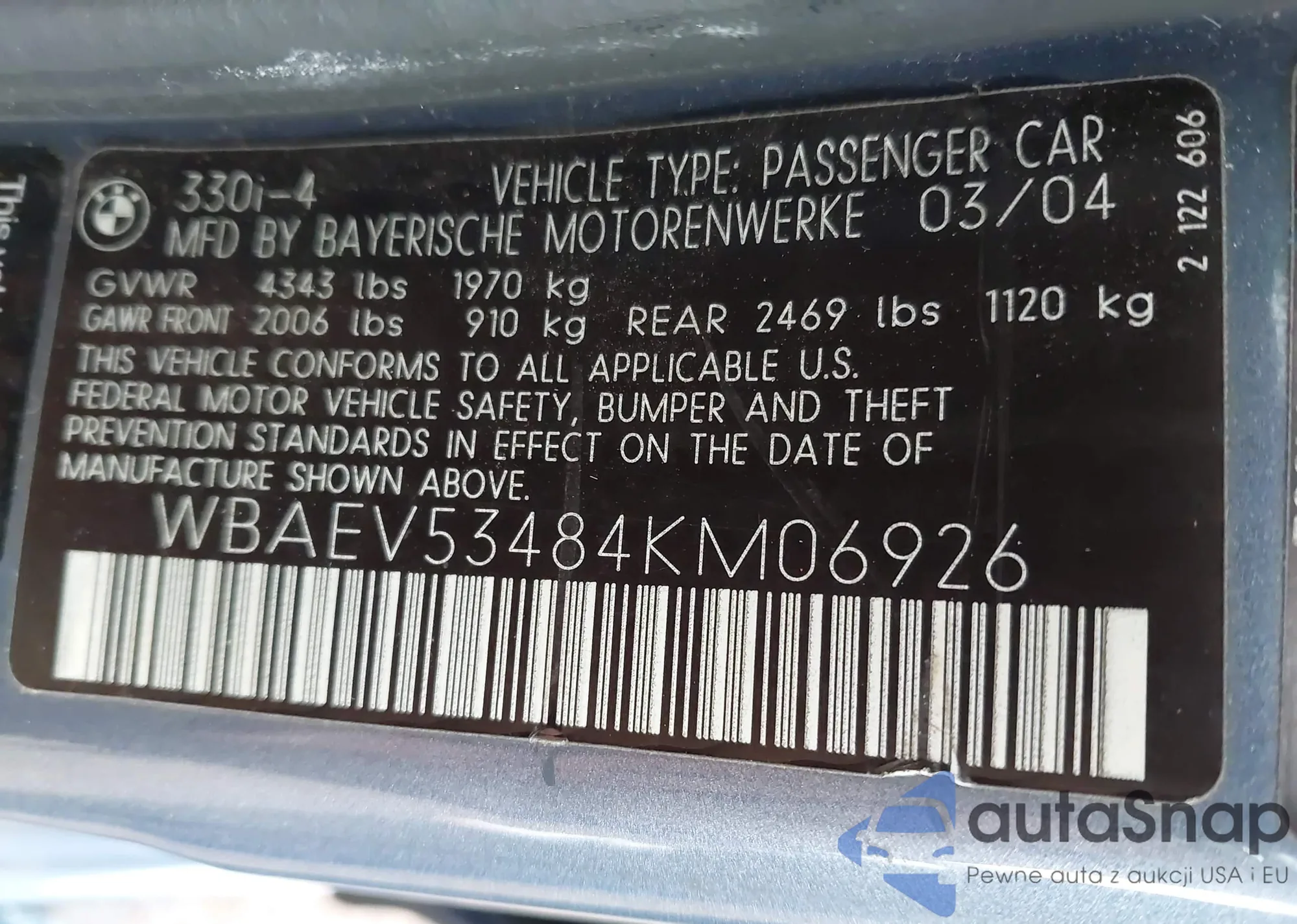 2004 BMW 330I z USA, uszkodzony, nr VIN WBAEV53484KM06926