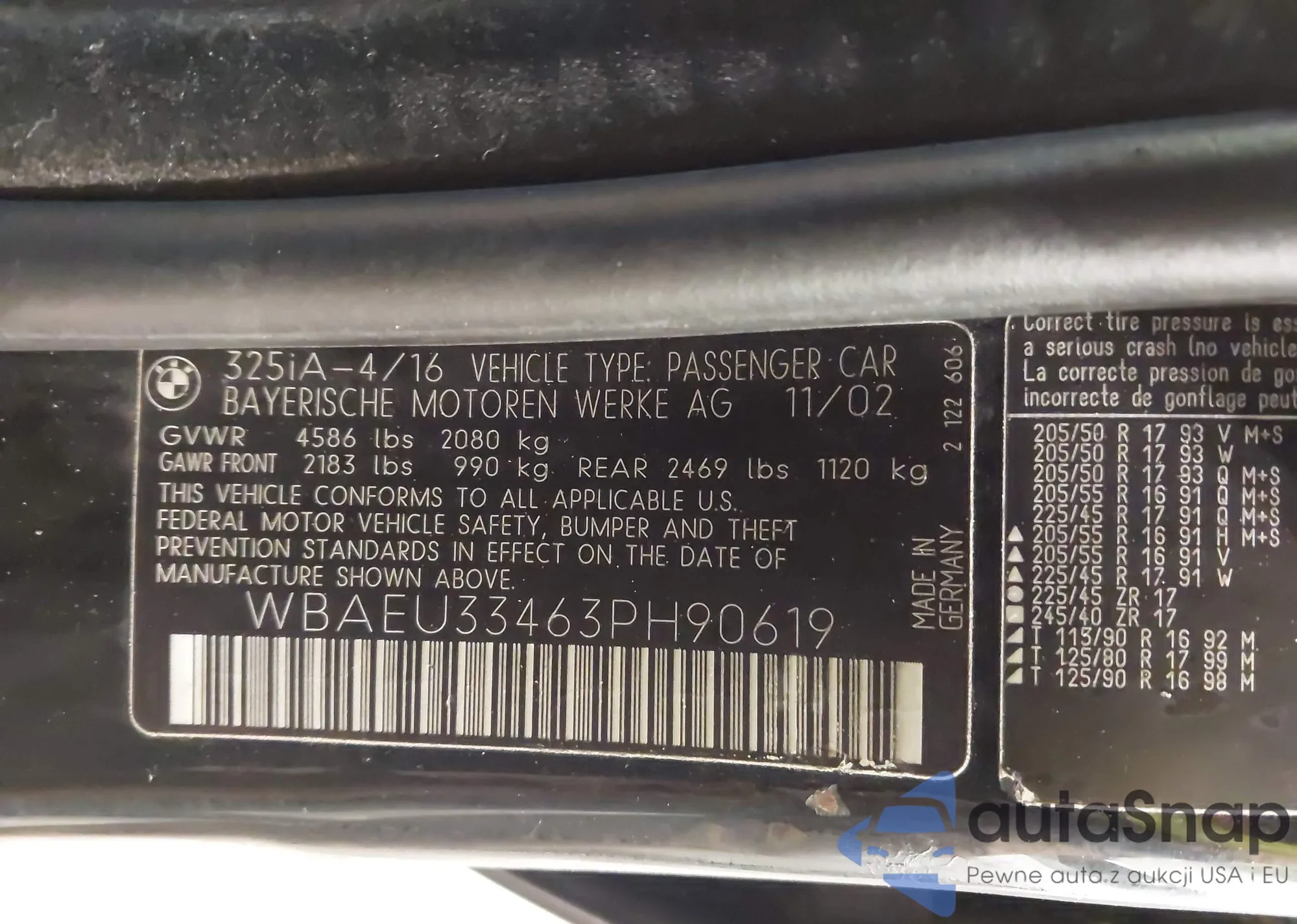 2003 BMW 325Xi z USA, uszkodzony, nr VIN WBAEU33463PH90619