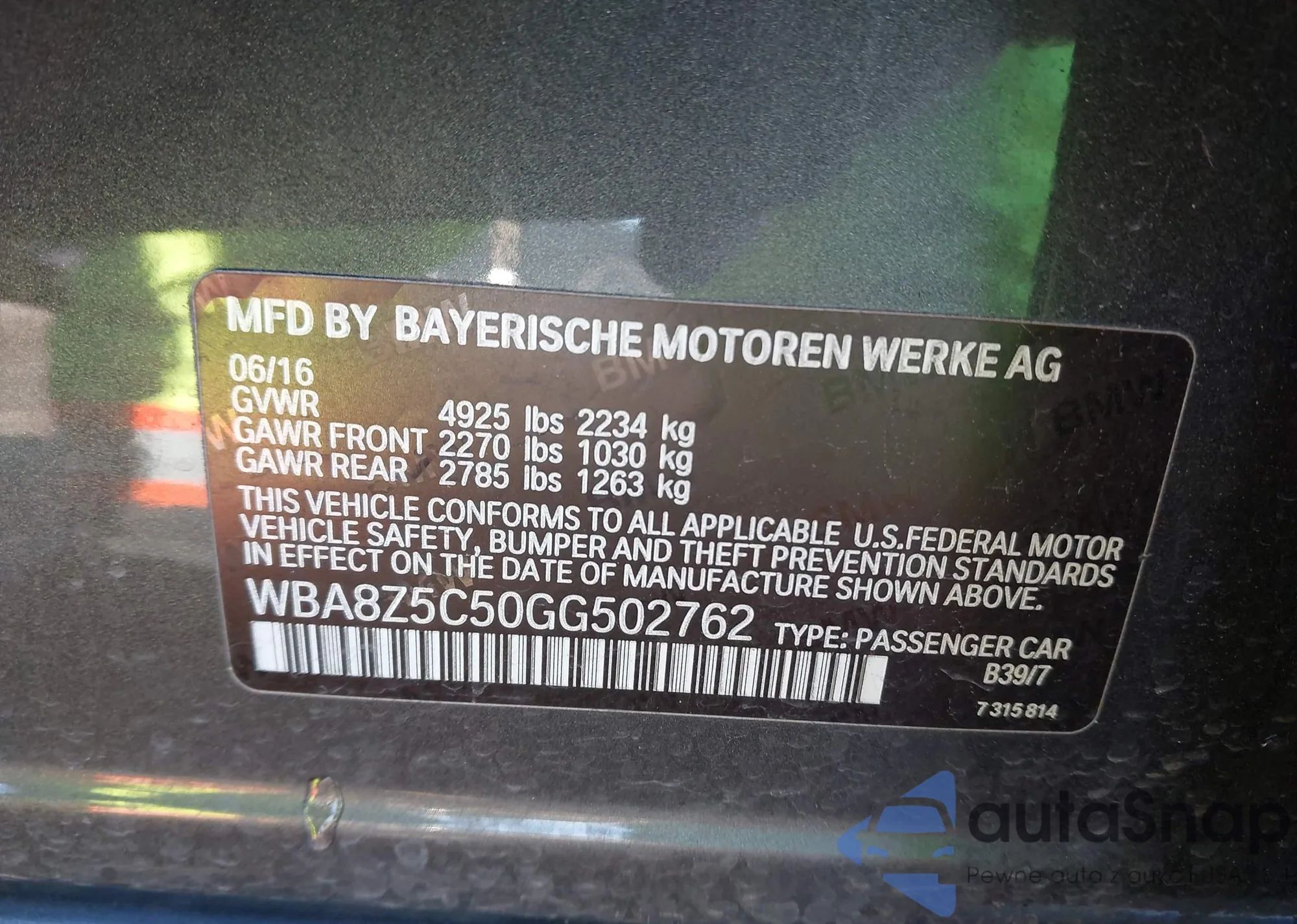 • VIN WBA8Z5C50GG502762