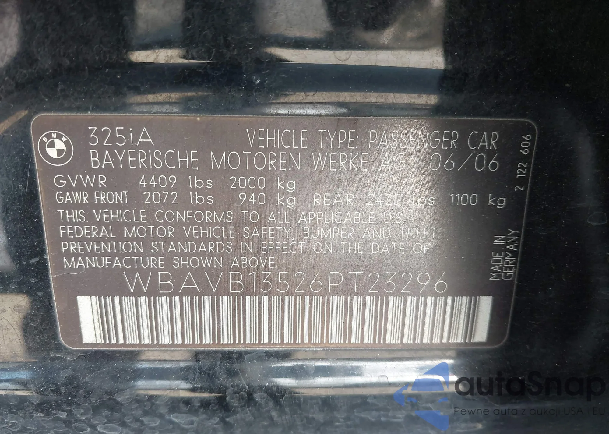 2006 BMW 325I z USA, uszkodzony, nr VIN WBAVB13526PT23296