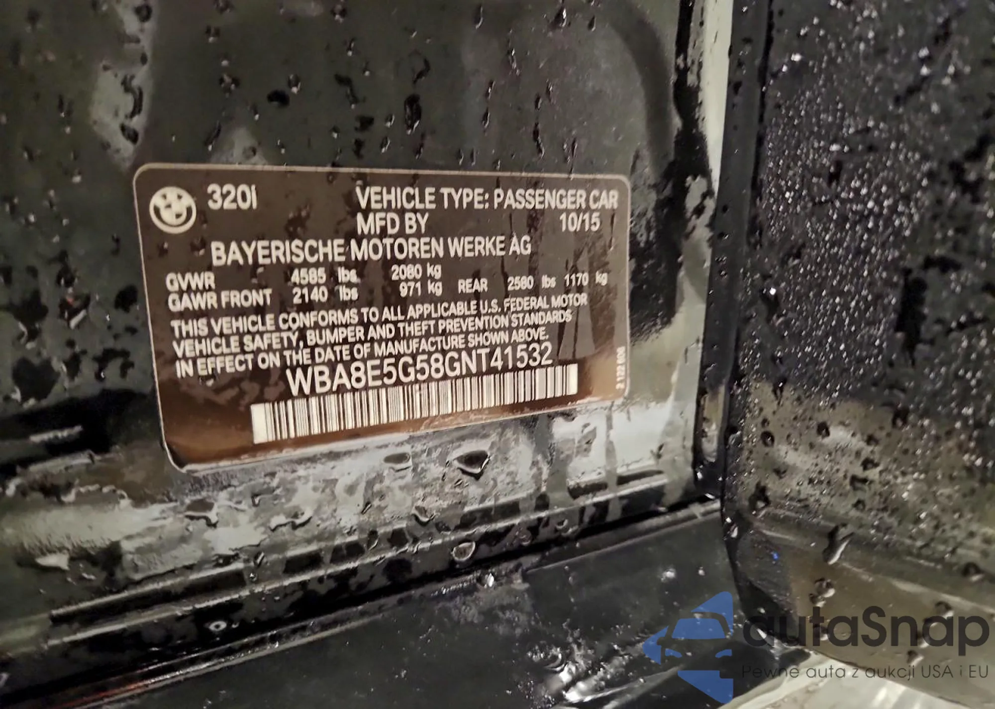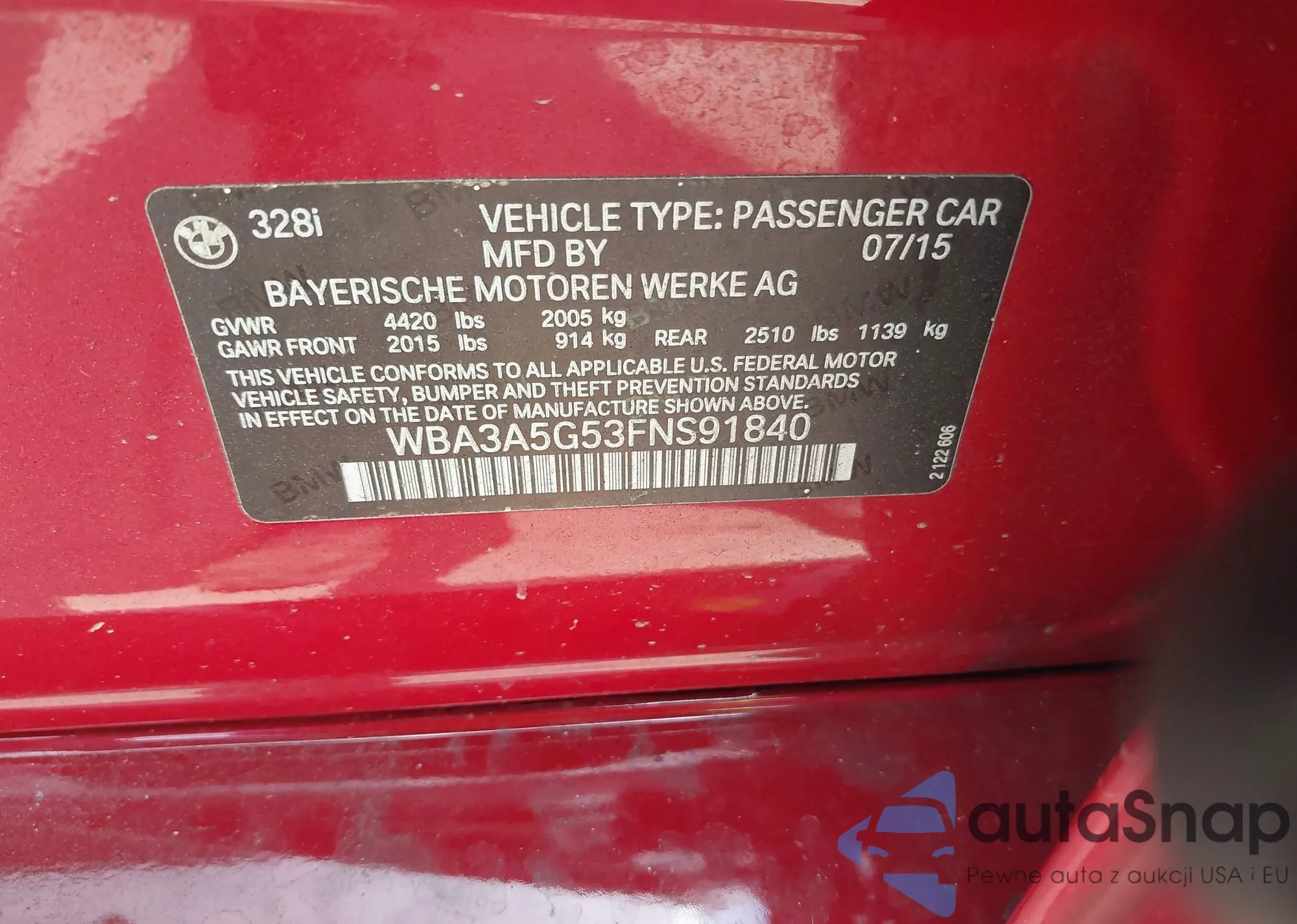 2015 BMW 328 Xi Sulev z USA, uszkodzony, nr VIN WBA3B5G54FNS16481