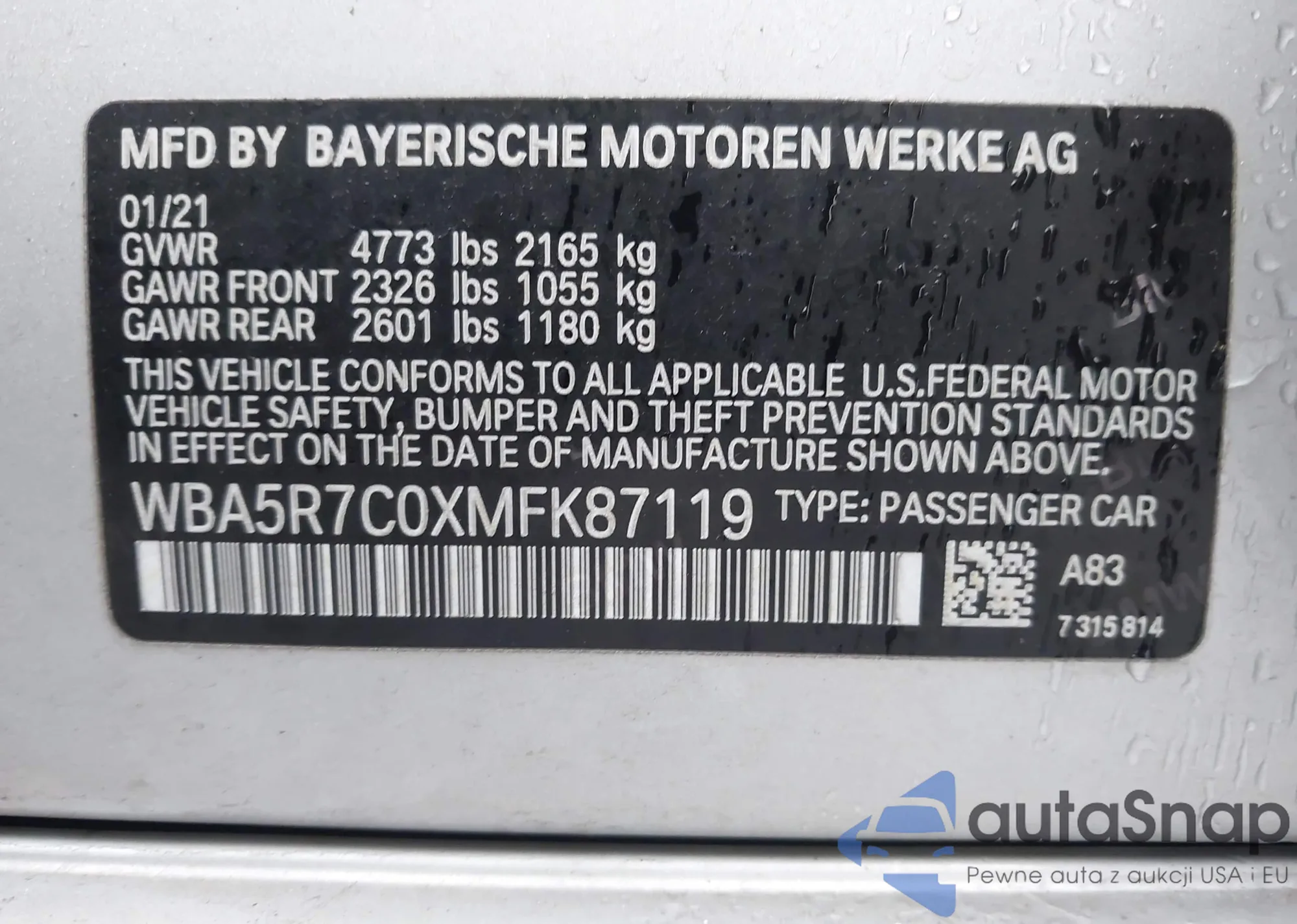 LOT: 44459552 VIN: WBA5U7C09MFK53834