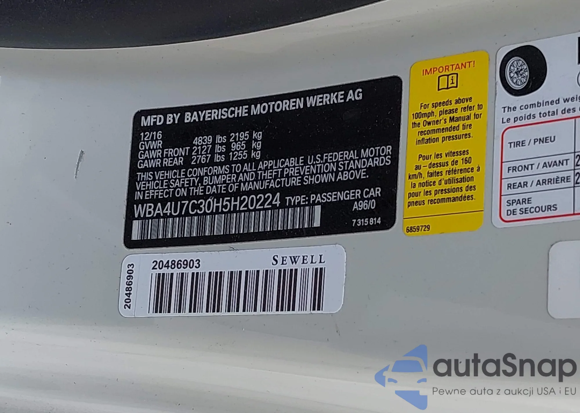 • VIN WBA4U7C30H5H20224