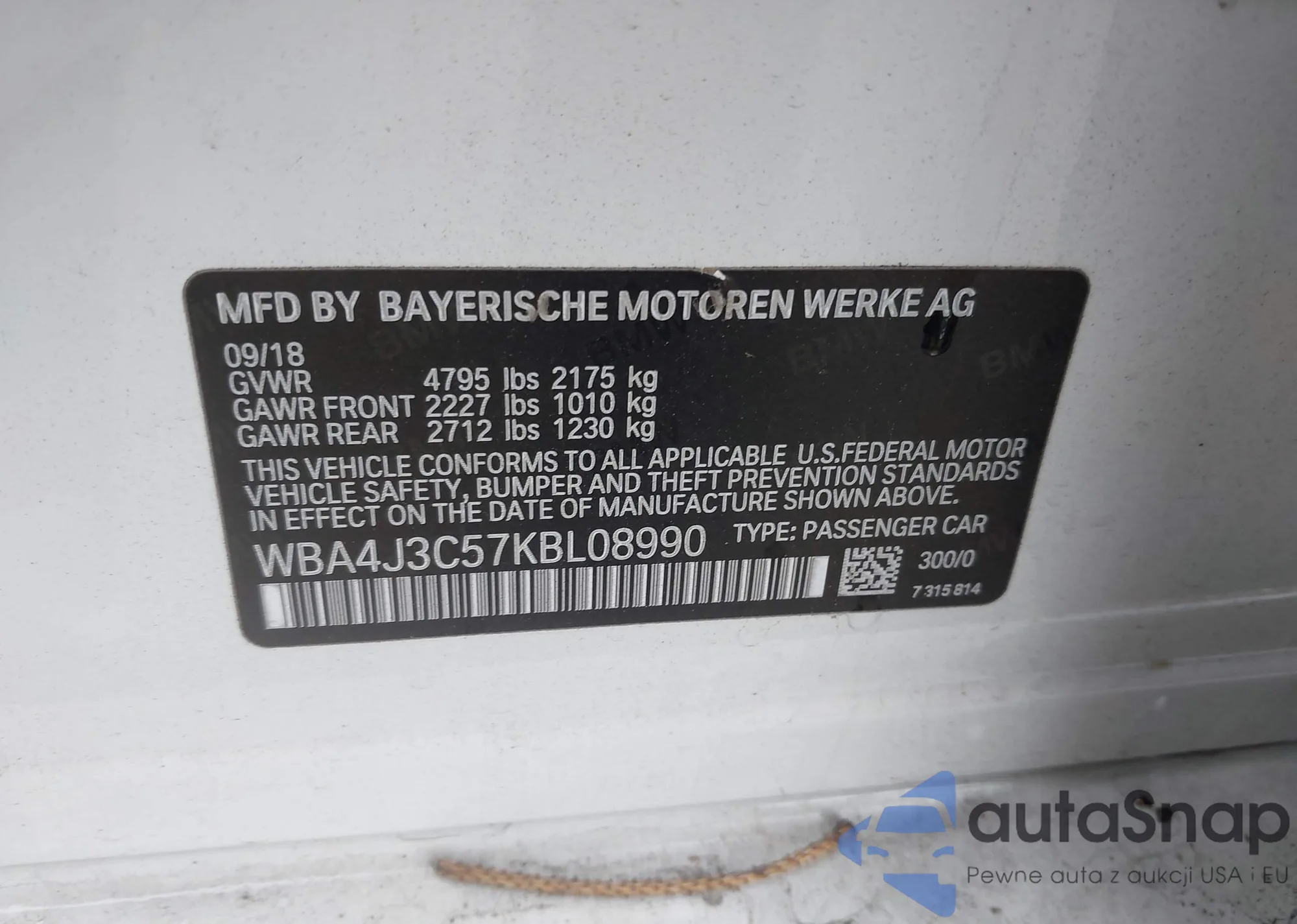 LOT: 43642379 VIN: WBA4J7C50KBM75487