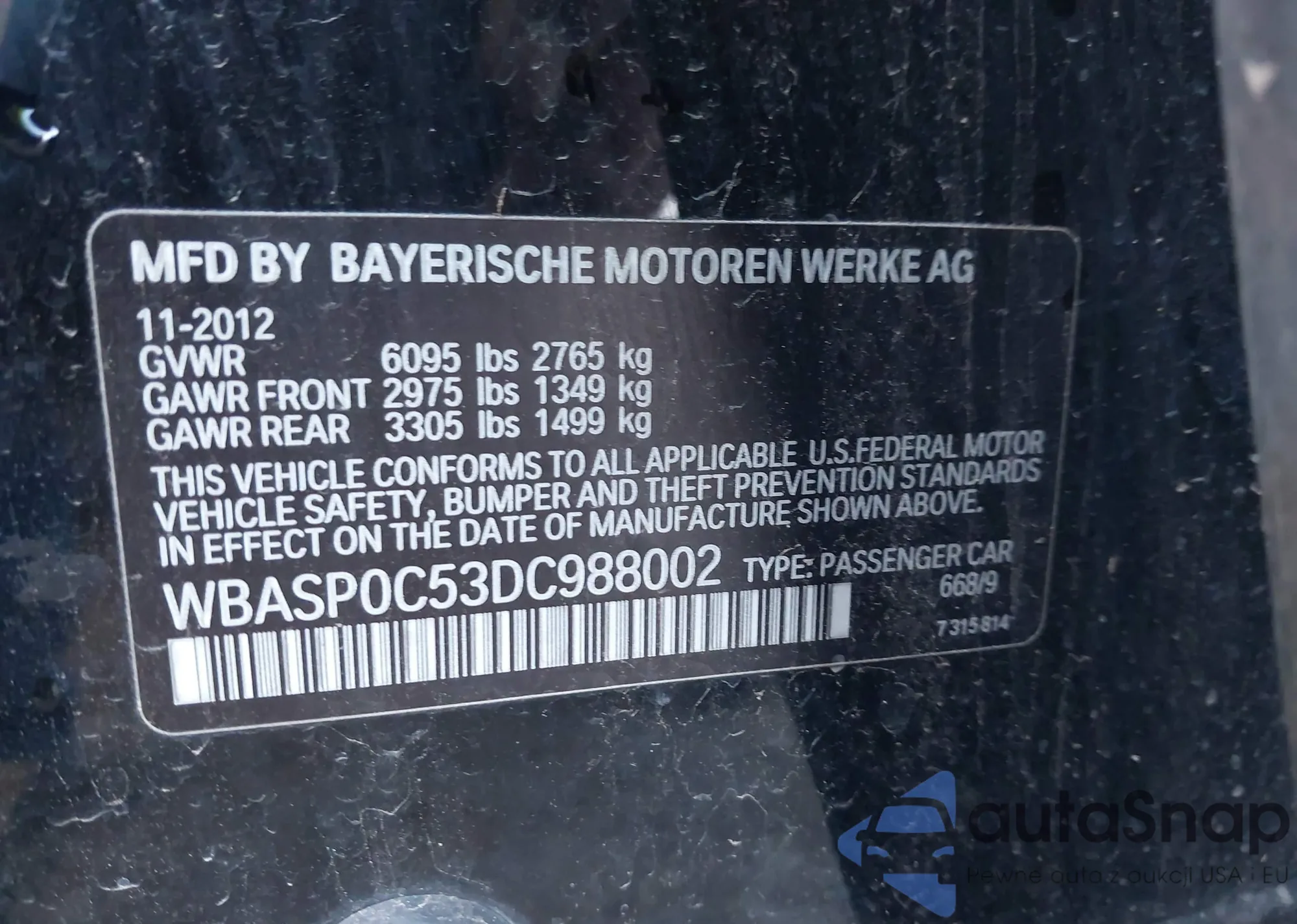 LOT: 44032763 VIN: WBASP0C53DC988002