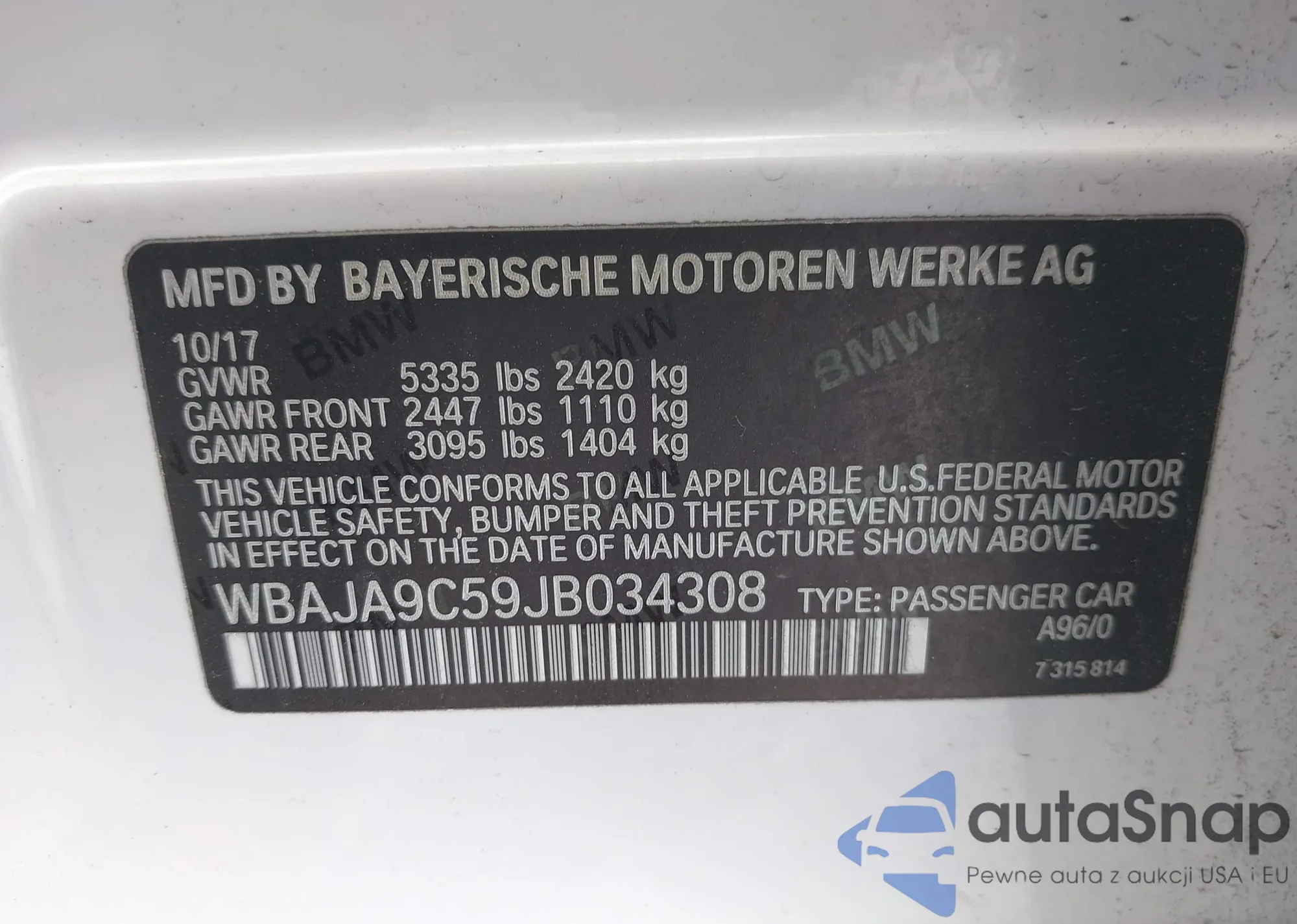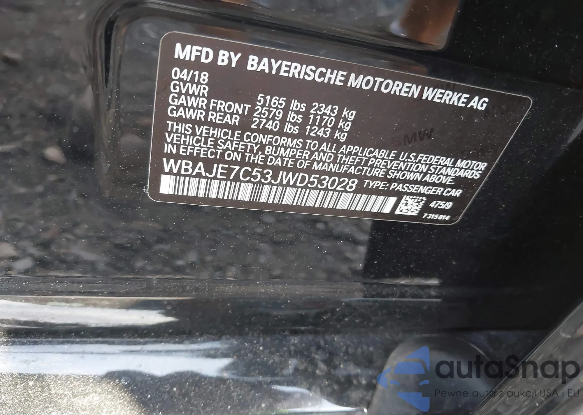 LOT: 43406330 VIN: WBAJE7C53JWD53028