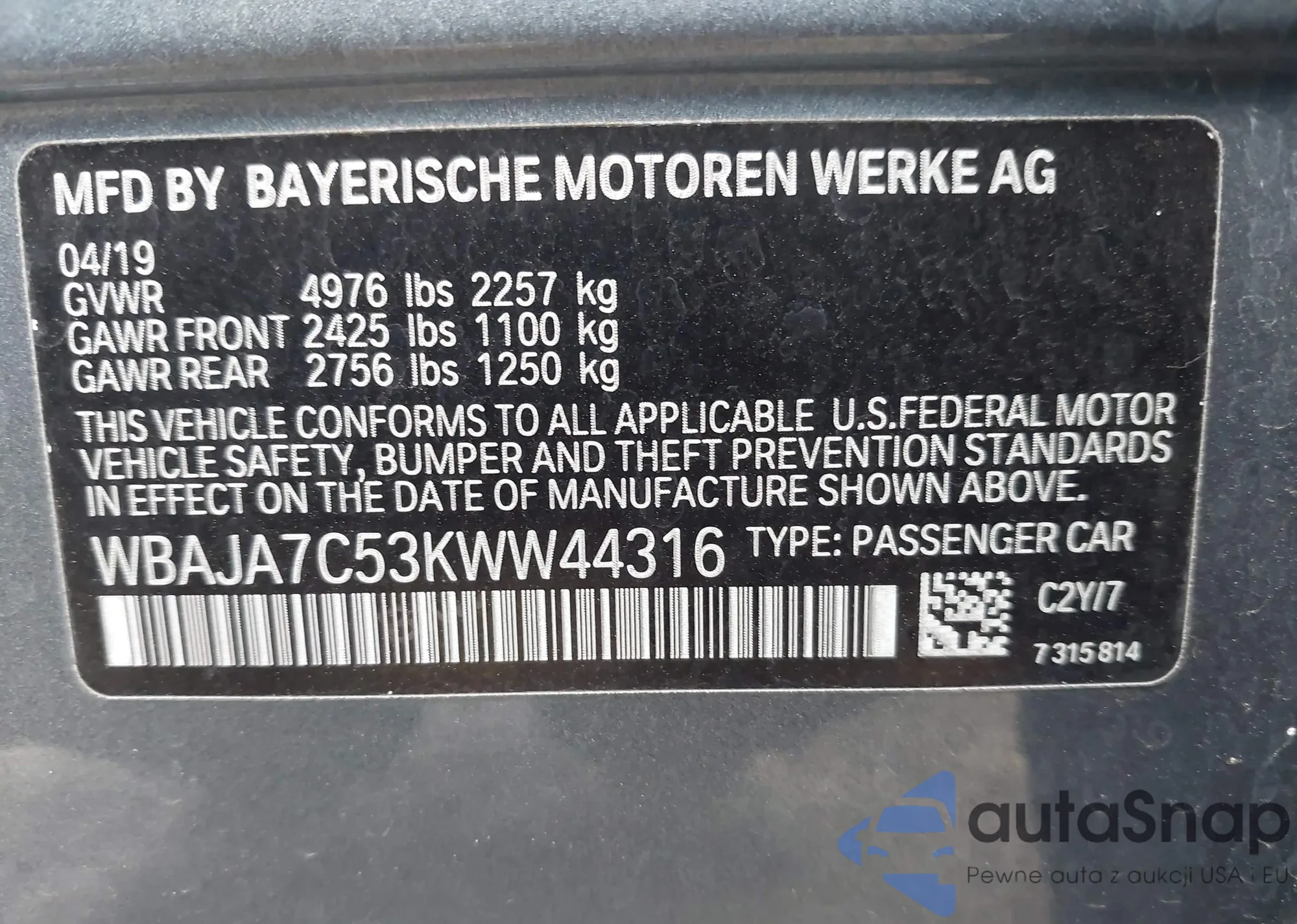 • VIN WBAJA7C53KWW44316
