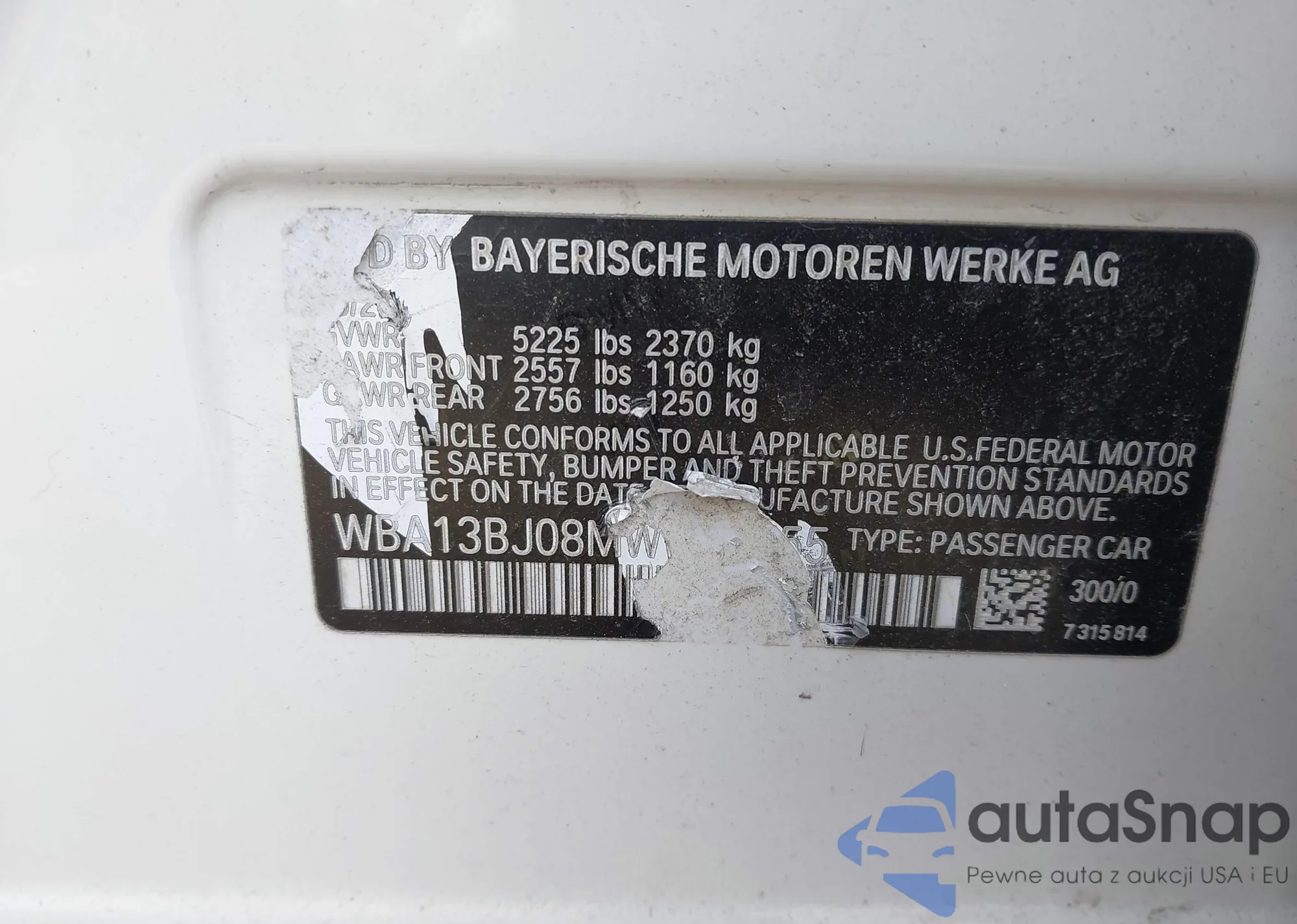 LOT: 44234253 VIN: WBA13BJ08MWW97455