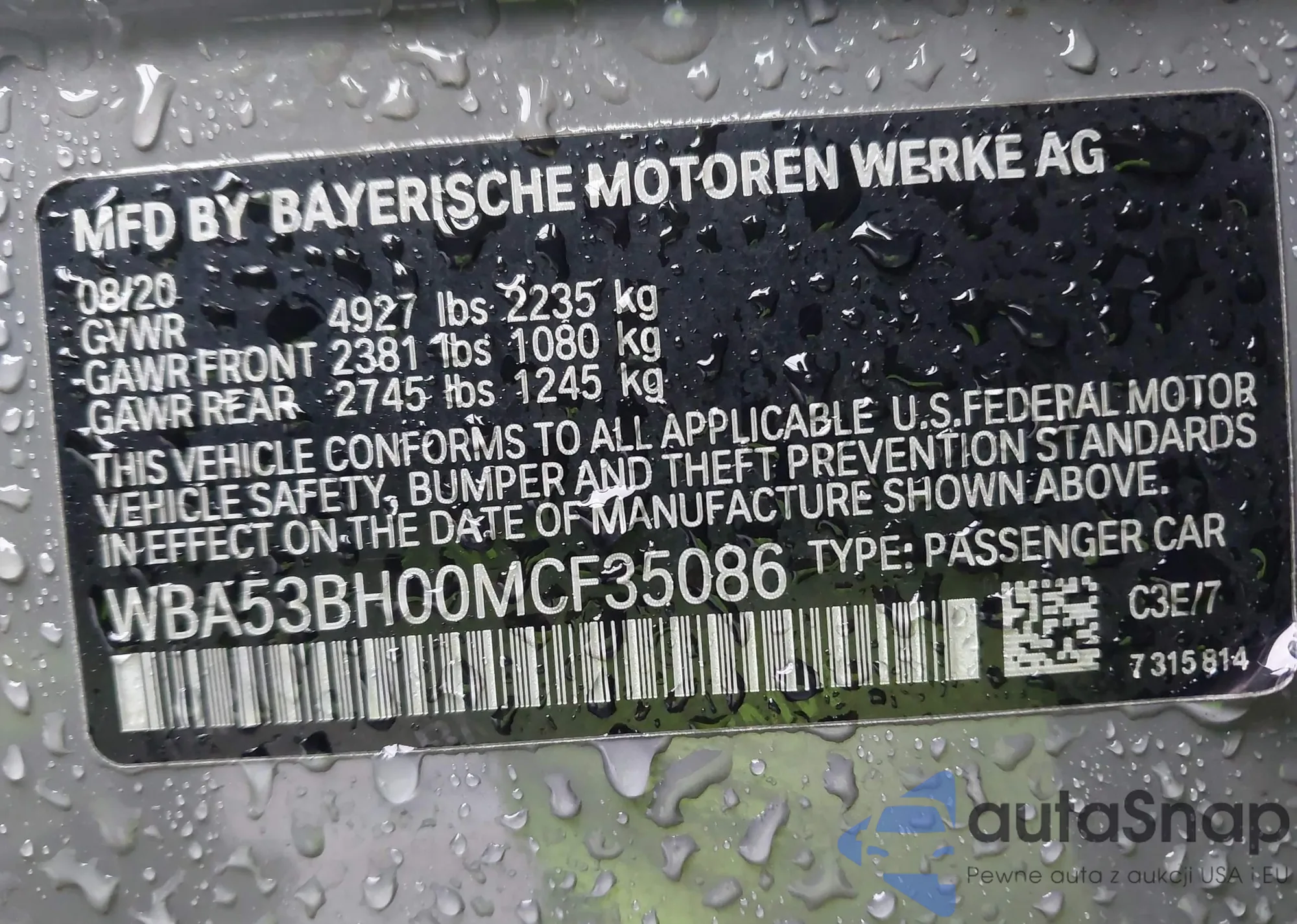 LOT: 44347874 VIN: WBA53BH00MCF35086