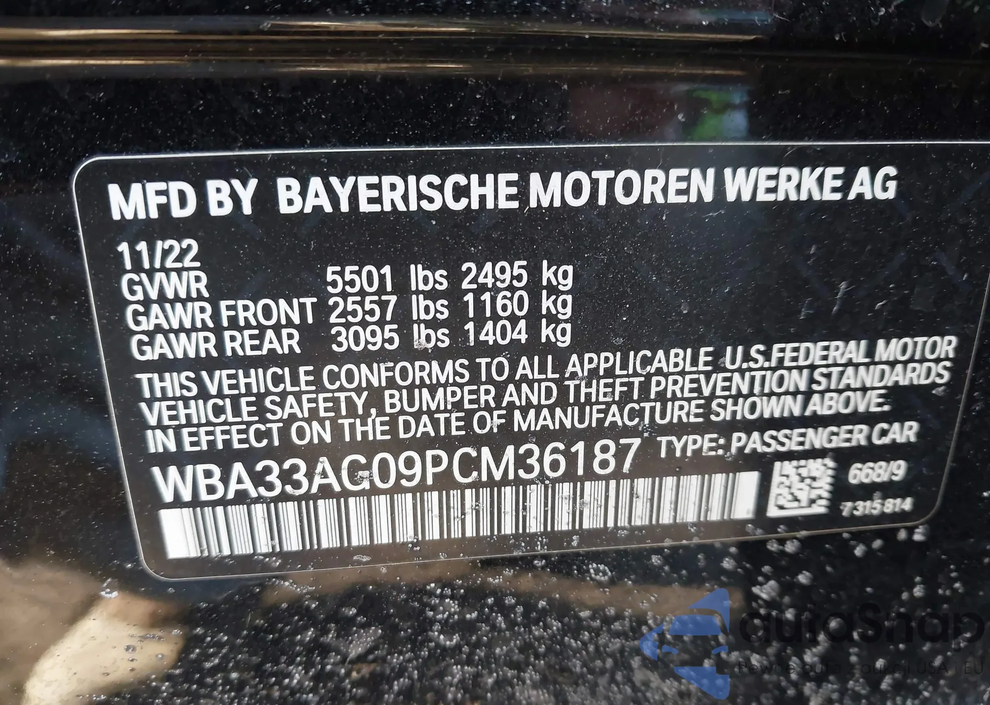 LOT: 44377171 VIN: WBA33AG09PCM36187