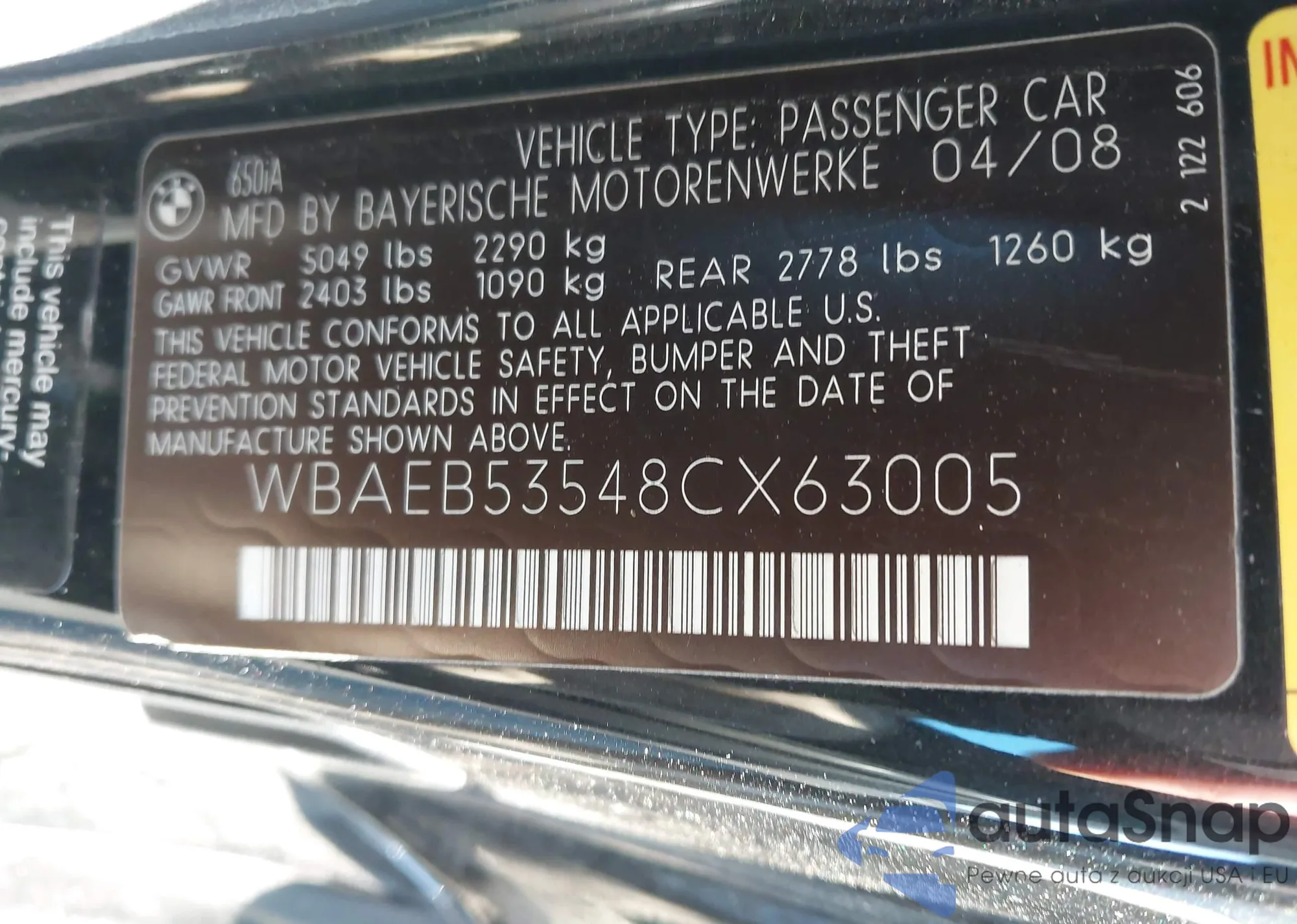 2008 BMW 650I z USA, uszkodzony, nr VIN WBAEB53548CX63005