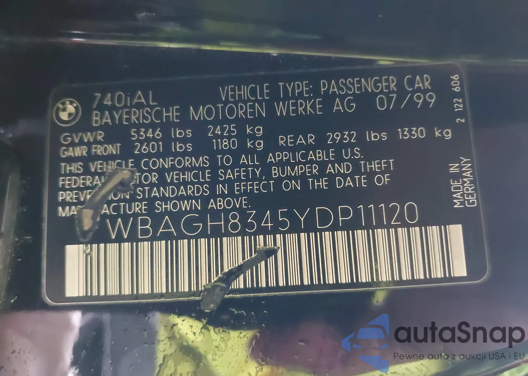 2000 BMW 740Il z USA, uszkodzony, nr VIN WBAGH8345YDP11120