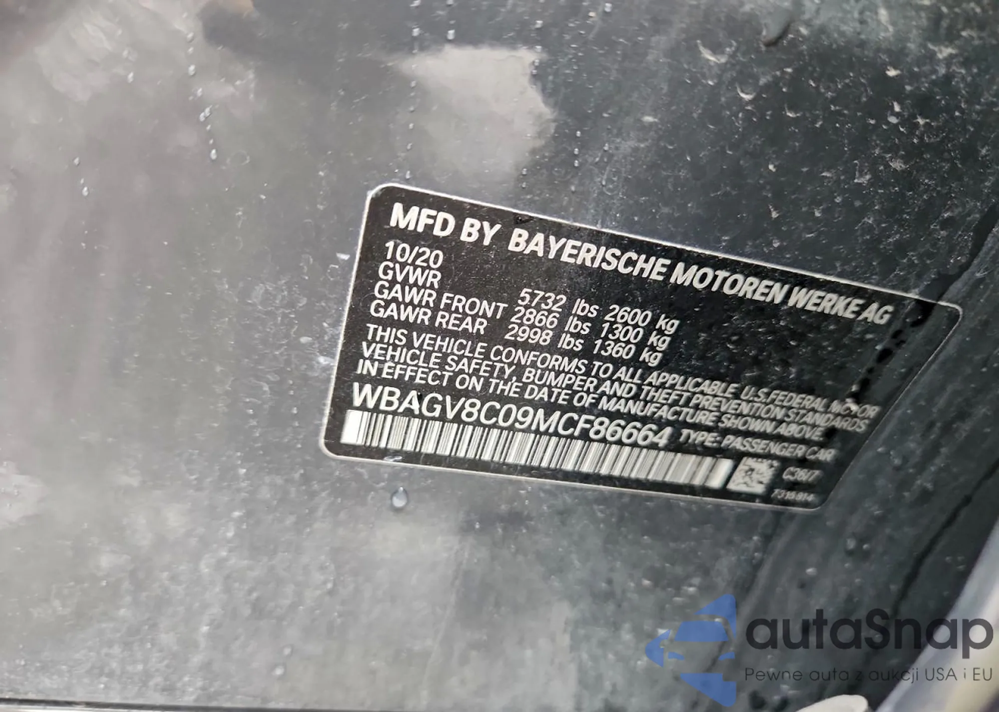 LOT: 93337035 VIN: WBAGV8C09MCF86664