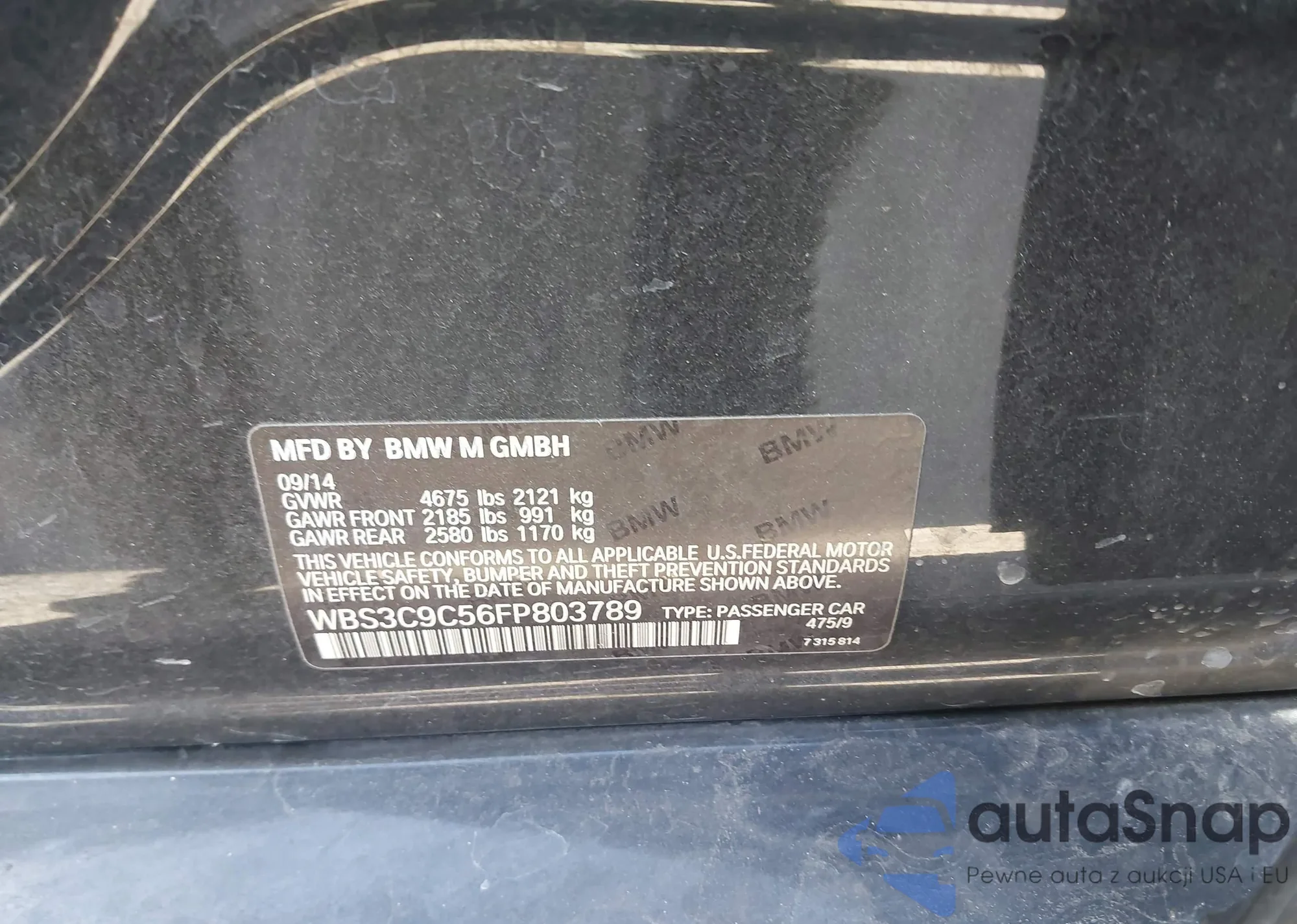 2015 BMW M3 z USA, uszkodzony, nr VIN WBS3C9C56FP803789