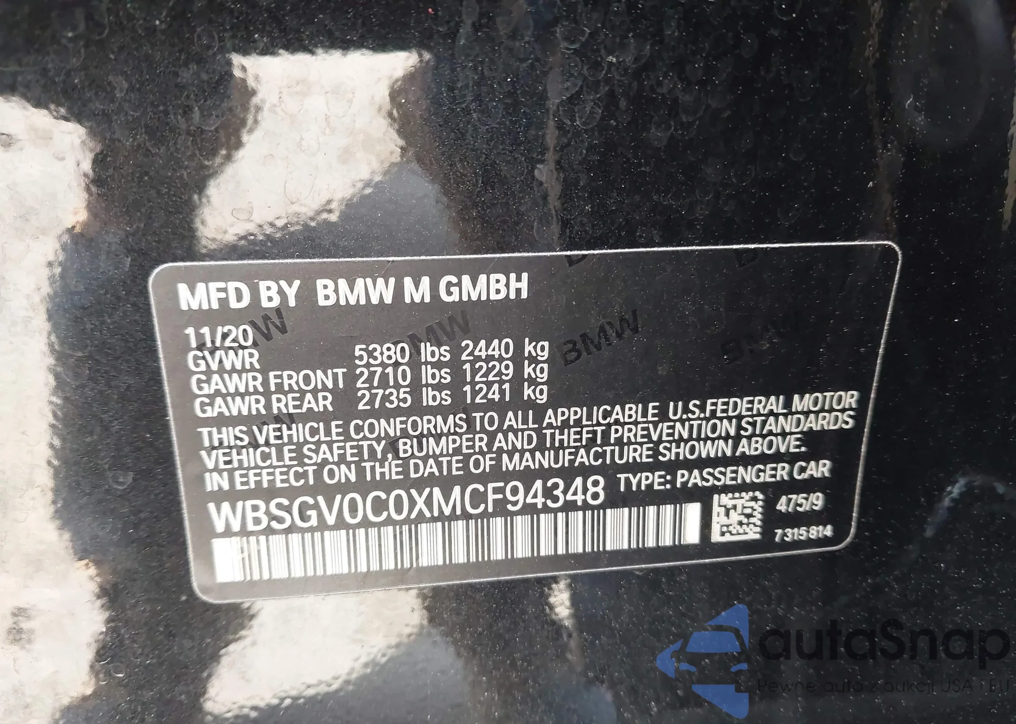 LOT: 43844586 VIN: WBSGV0C08MCF18918