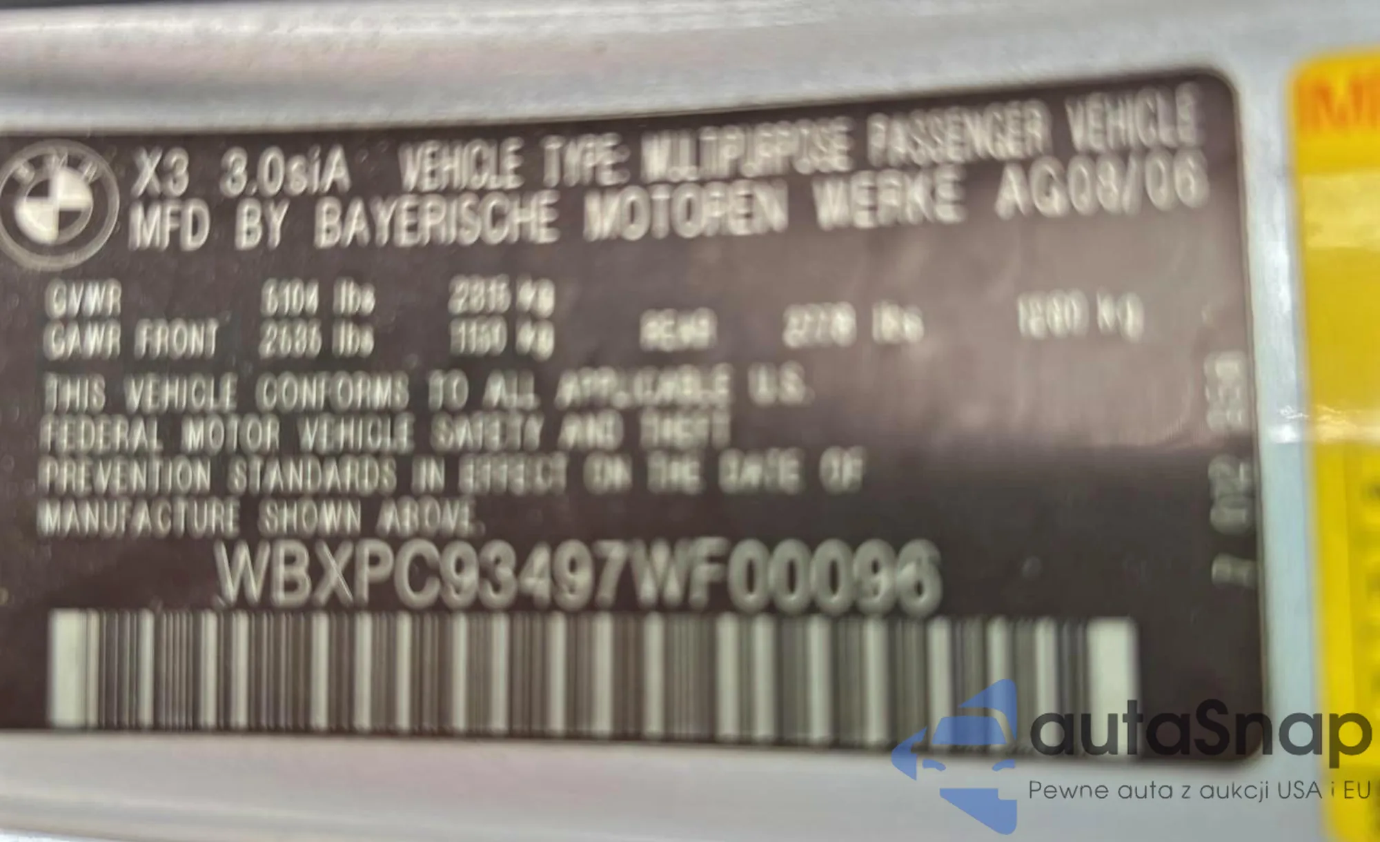 2007 BMW X3 3.0Si z USA, uszkodzony, nr VIN WBXPC93497WF00096