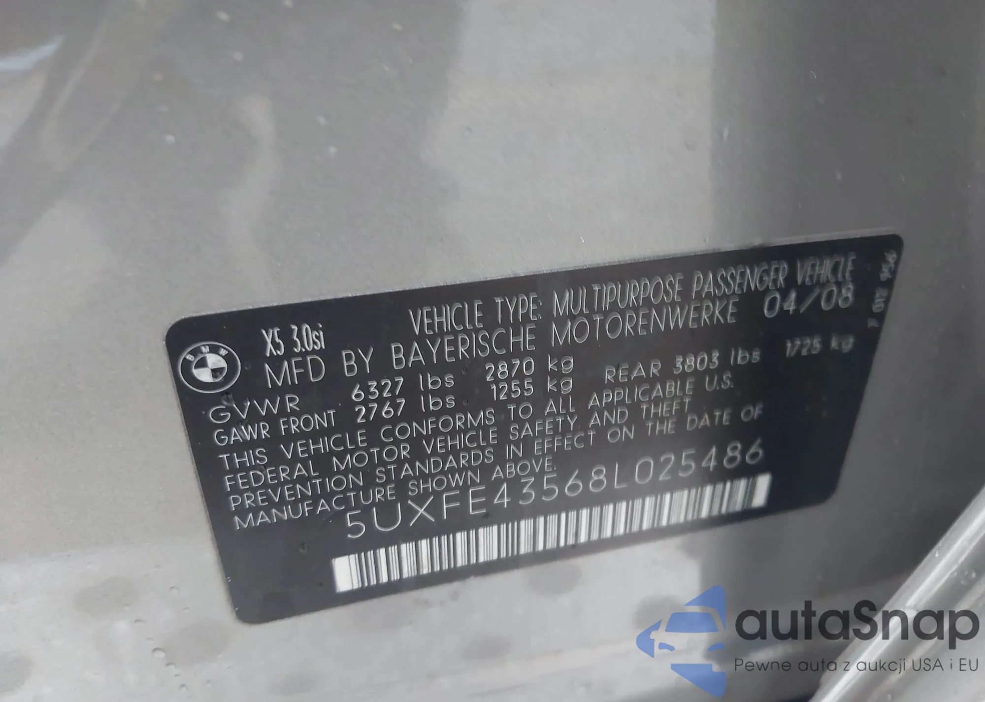 2008 BMW X5 3.0Si z USA, uszkodzony, nr VIN 5UXFE43568L025486