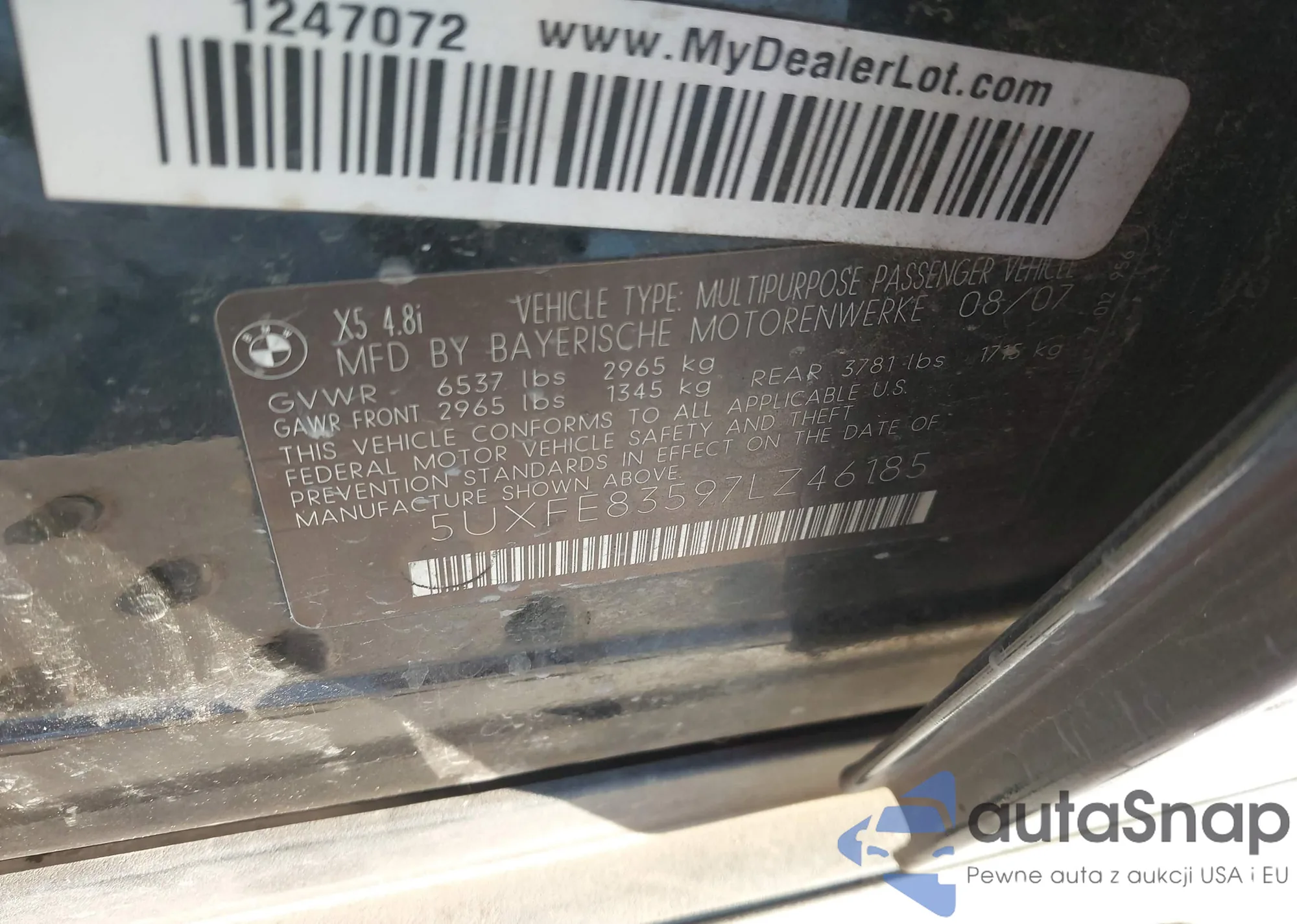 2007 BMW X5 4.8I z USA, uszkodzony, nr VIN 5UXFE83597LZ46185