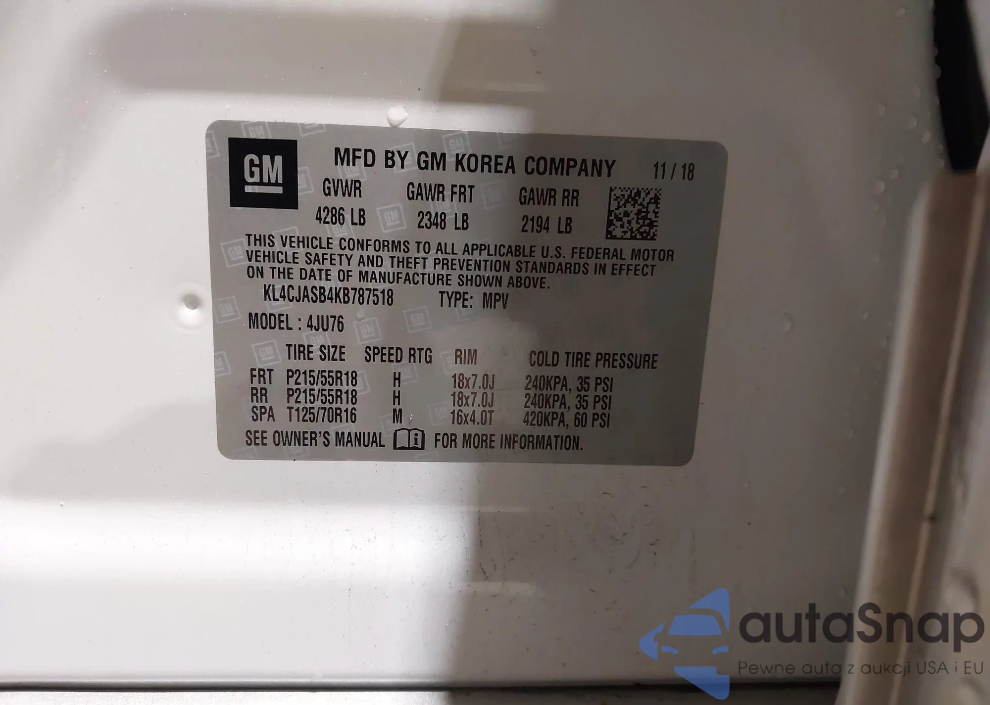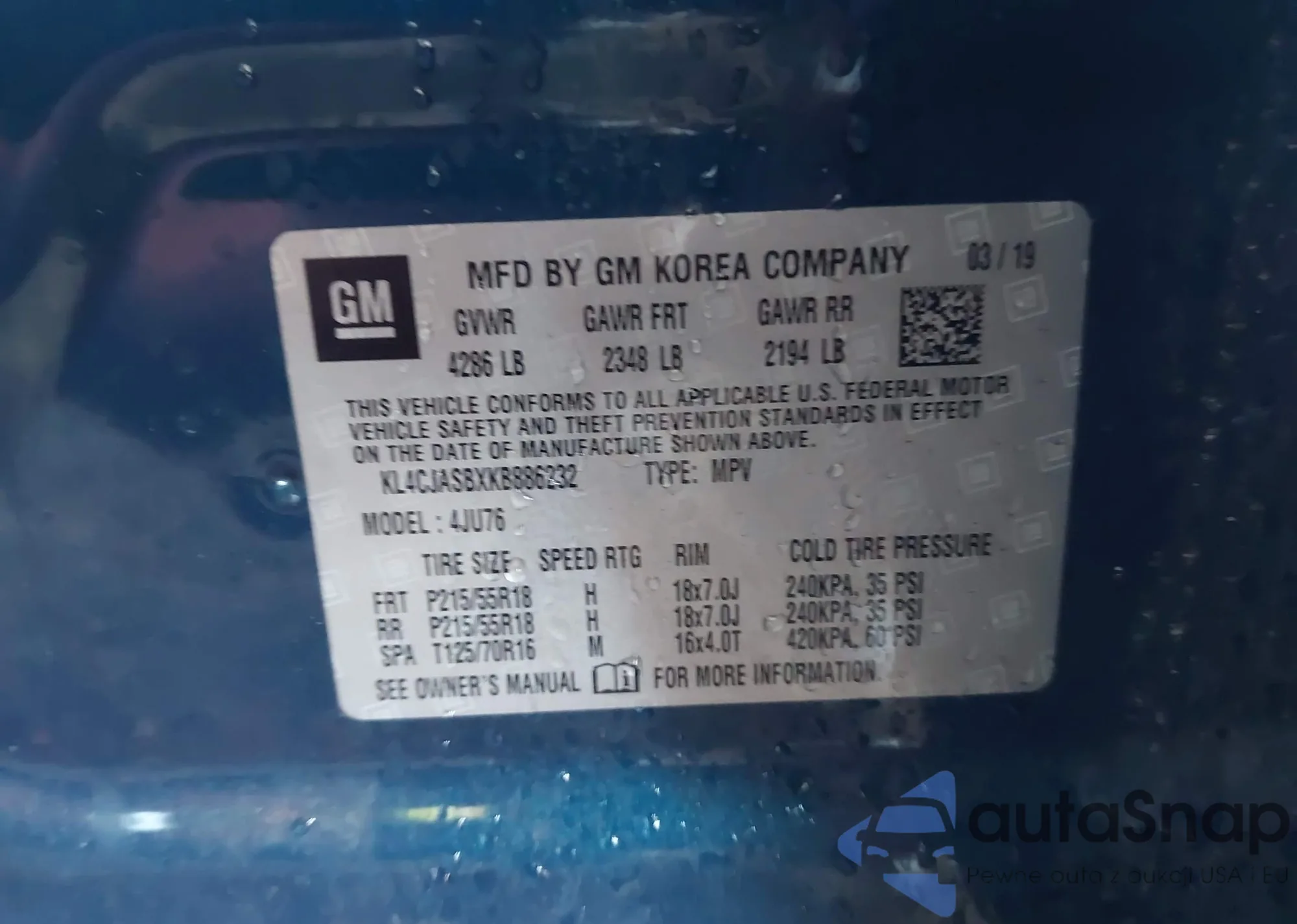 • VIN KL4CJASB4KB787518