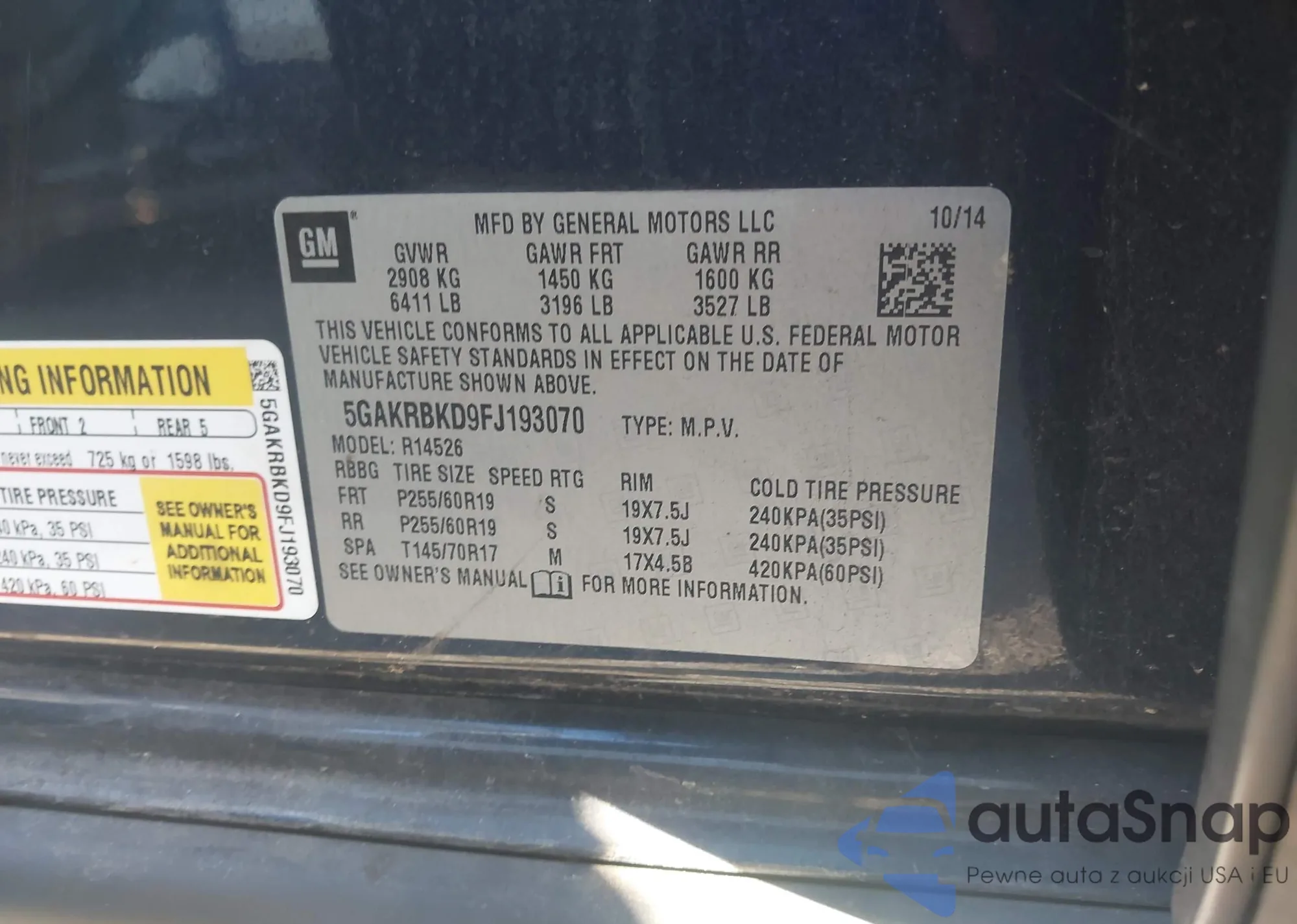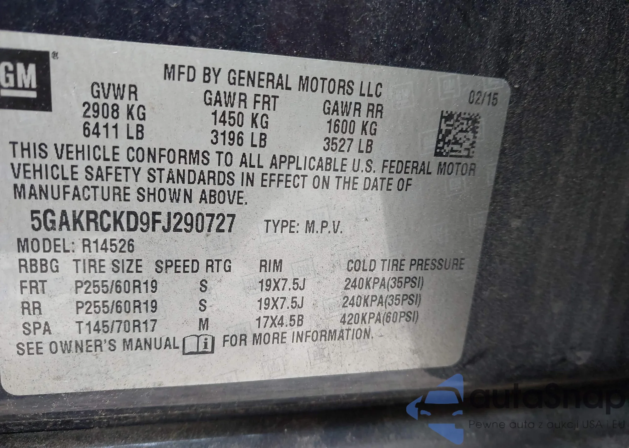 • VIN 5GAKRCKD9FJ290727