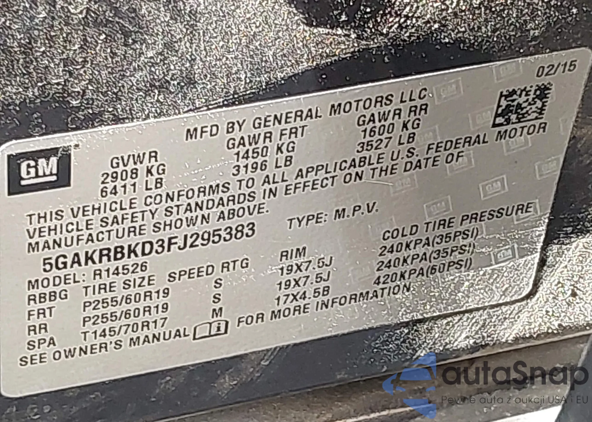 • VIN 5GAKRBKD3FJ295383