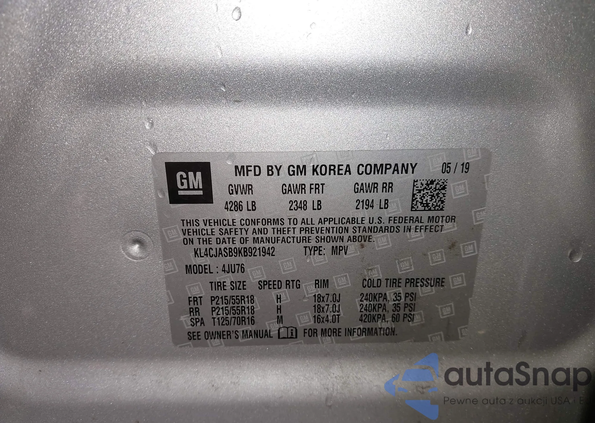 • VIN KL4CJCSM7KB957187