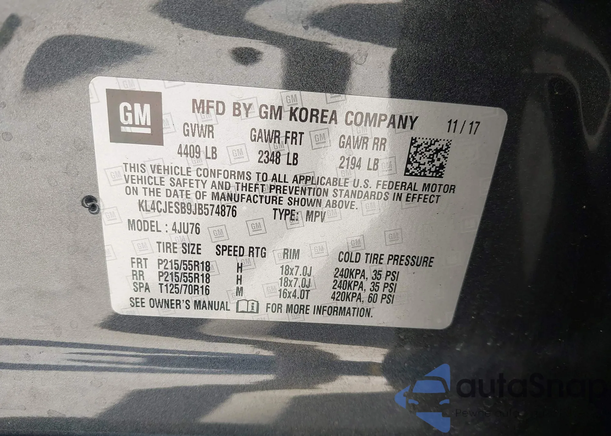 • VIN KL4CJESB9JB574876