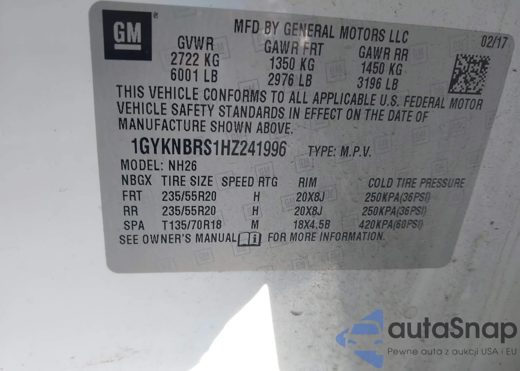 LOT: 44043897 VIN: 1GYKNBRS1HZ241996