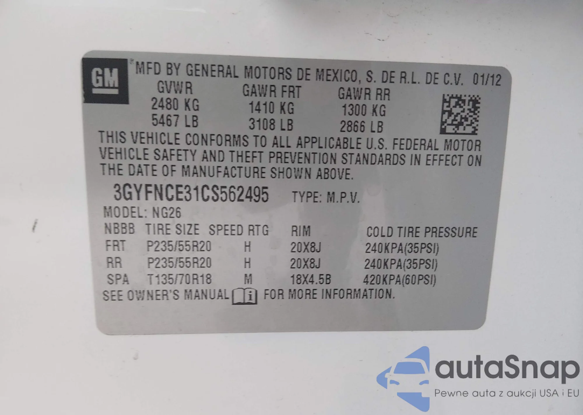 • VIN 3GYFNCE31CS562495