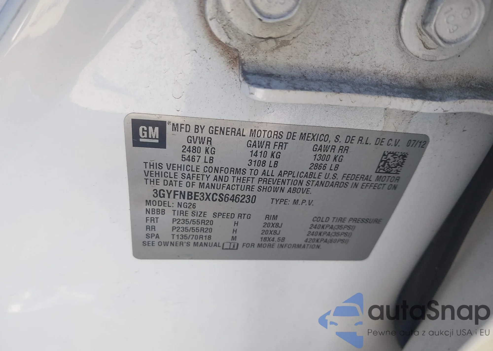 • VIN 3GYFNBE3XCS646230