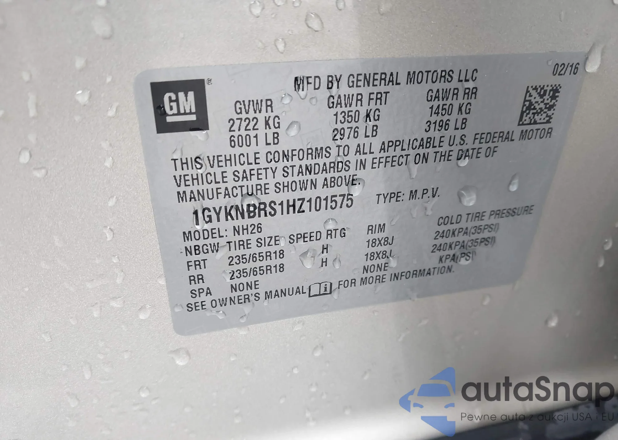 LOT: 43969991 VIN: 1GYKNBRS1HZ101575