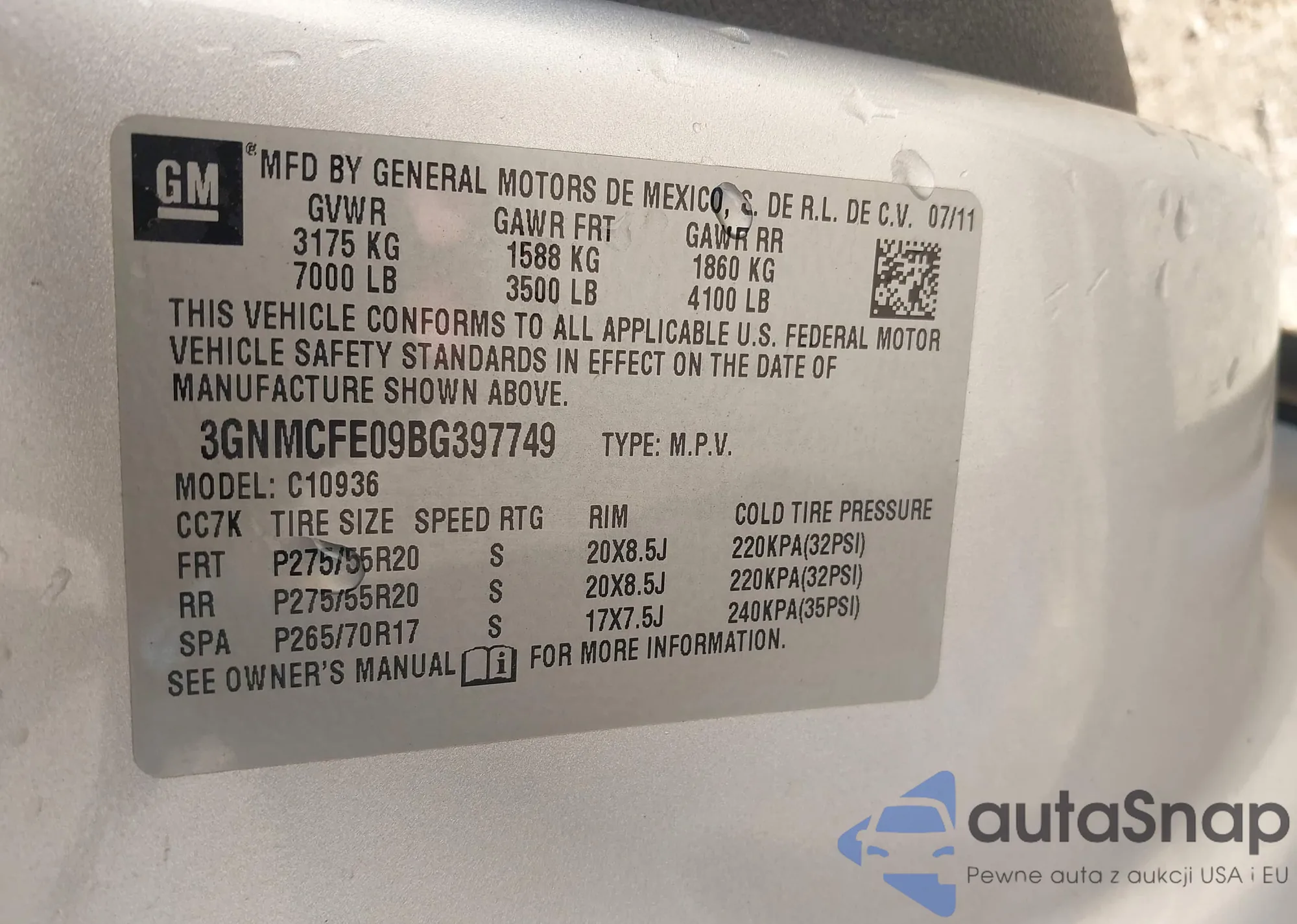• VIN 3GNMCFE09BG397749