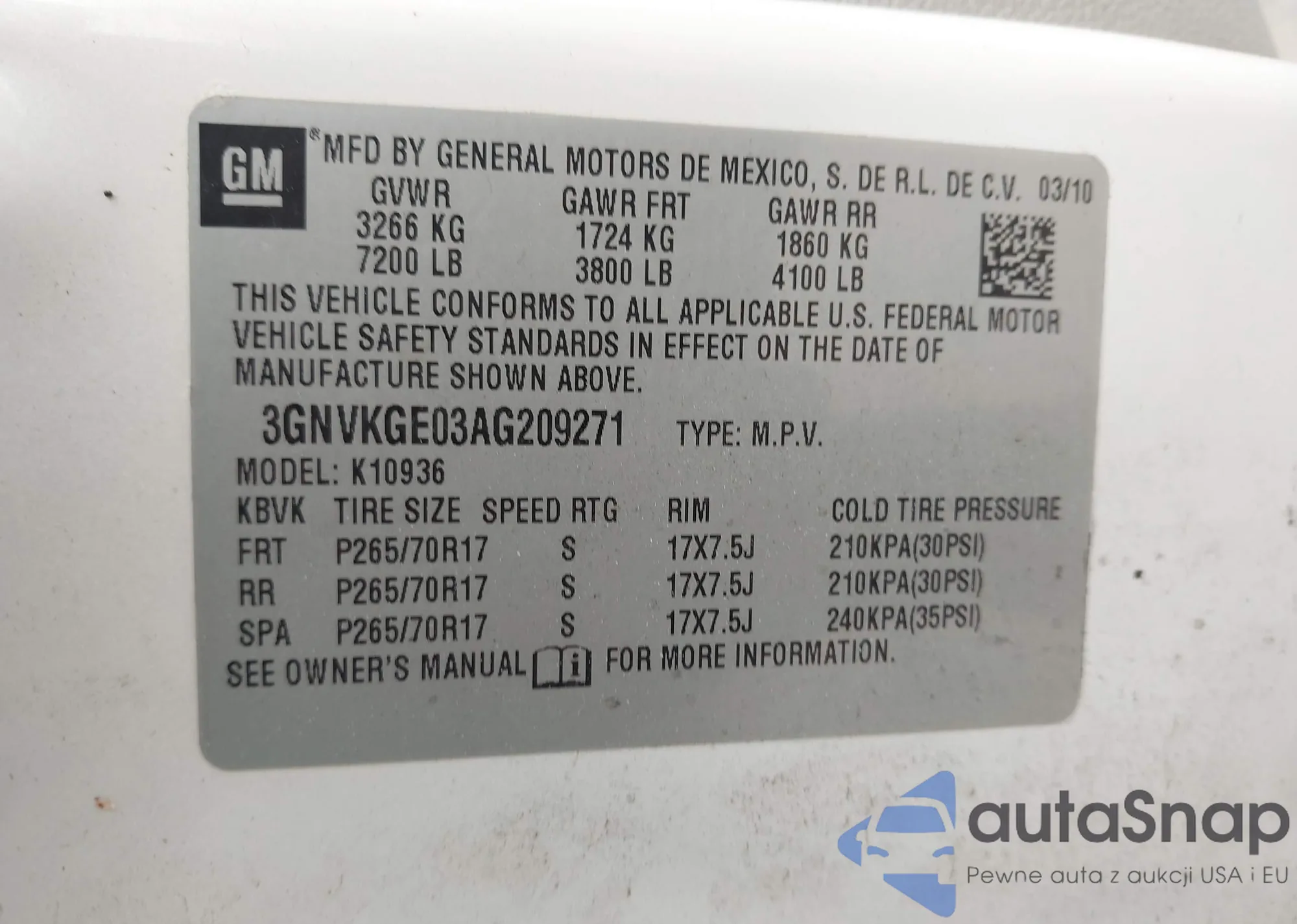 • VIN 3GNVKGE03AG209271