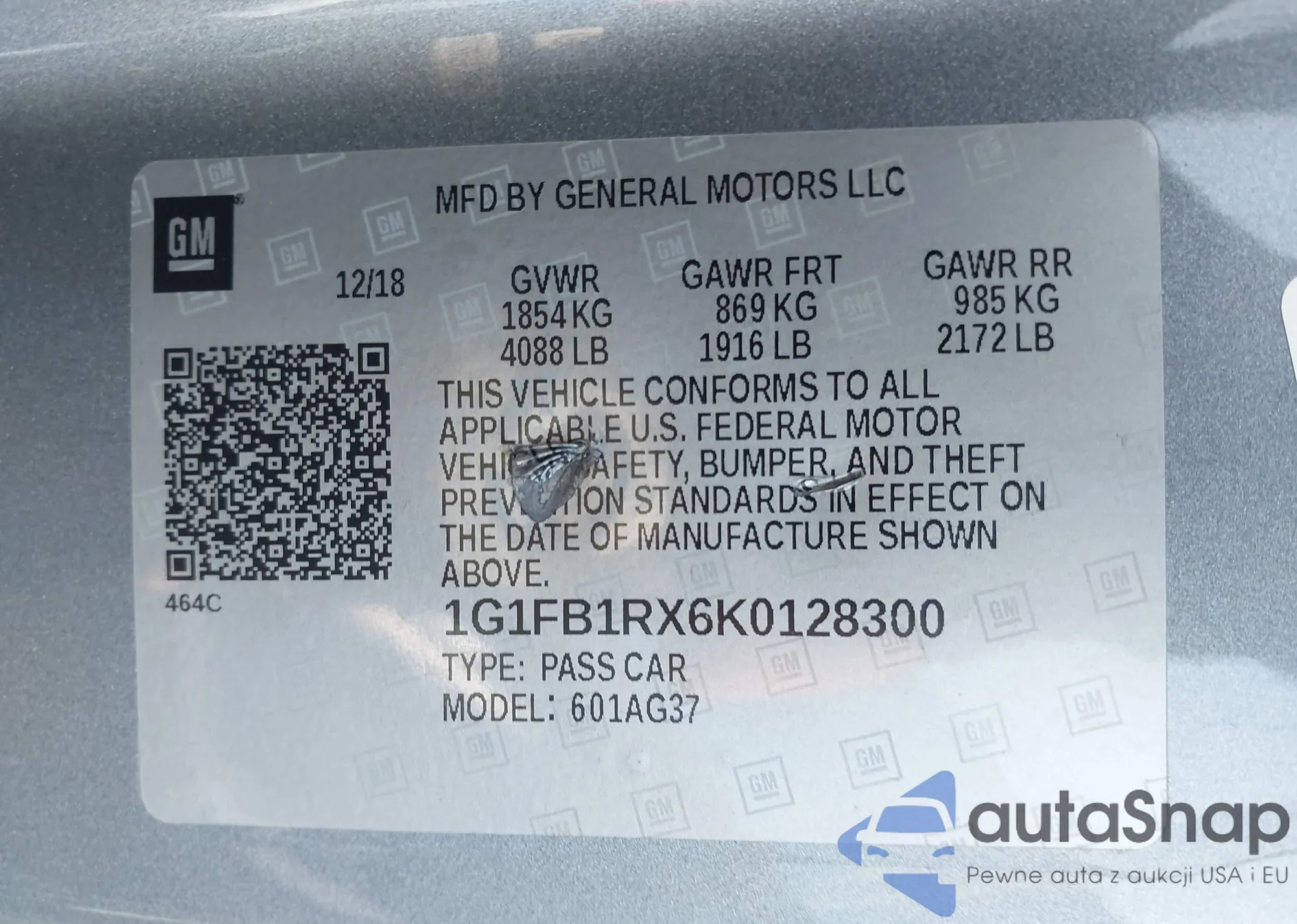 LOT: 43298495 VIN: 1G1FB1RX6K0128300