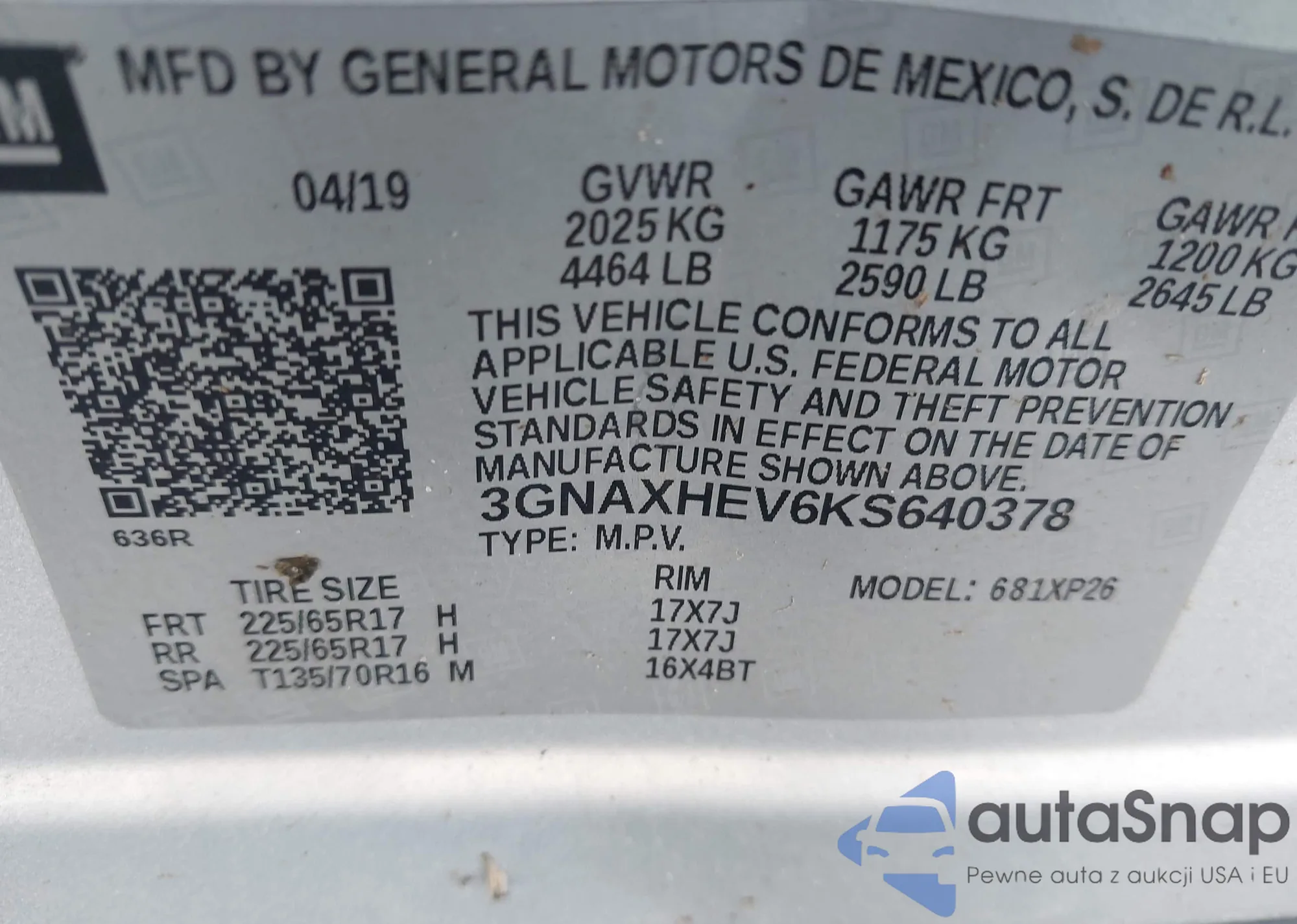 LOT: 44230681 VIN: 3GNAXHEV6KS528048