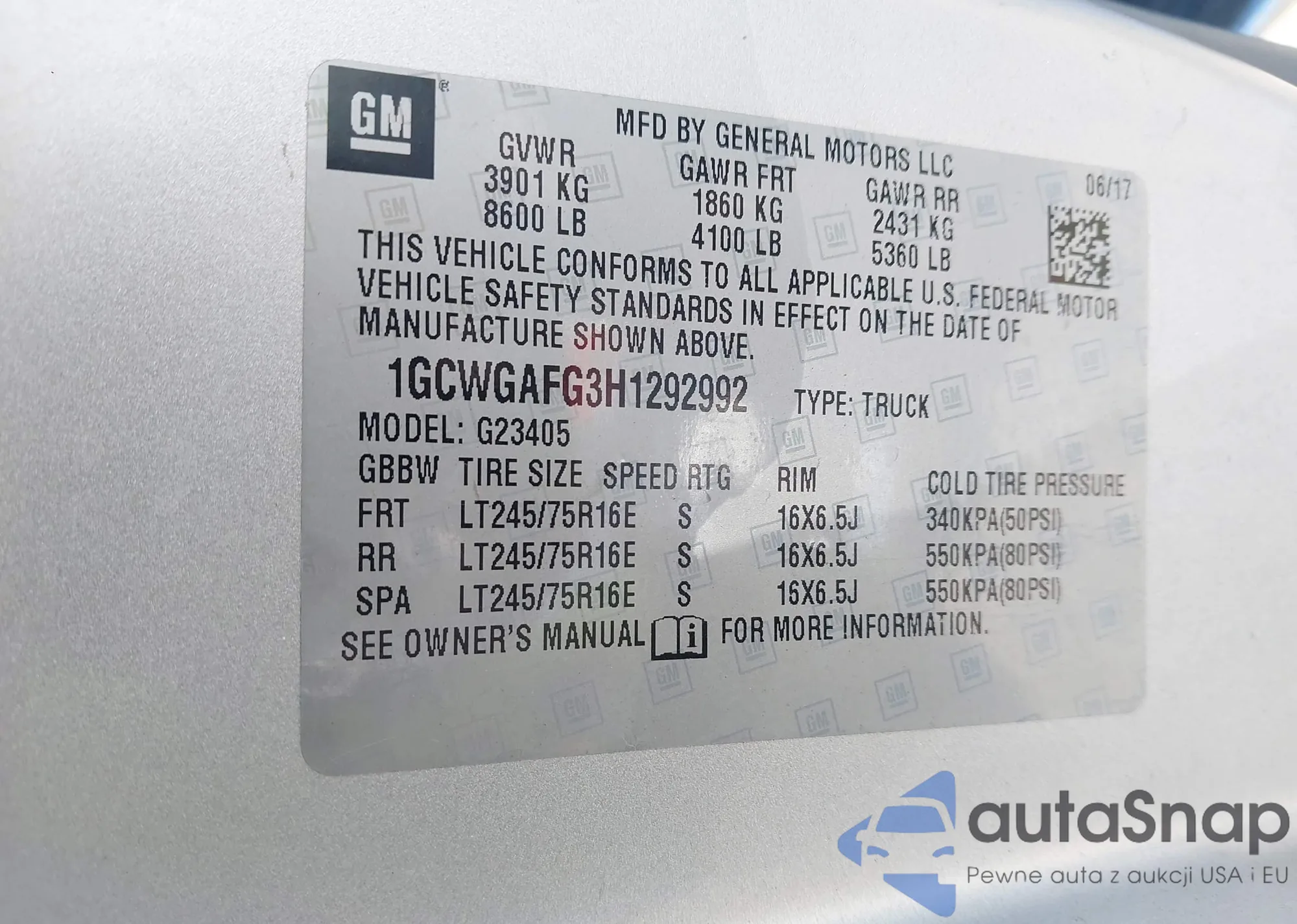 LOT: 44086949 VIN: 1GCWGAFG3H1292992