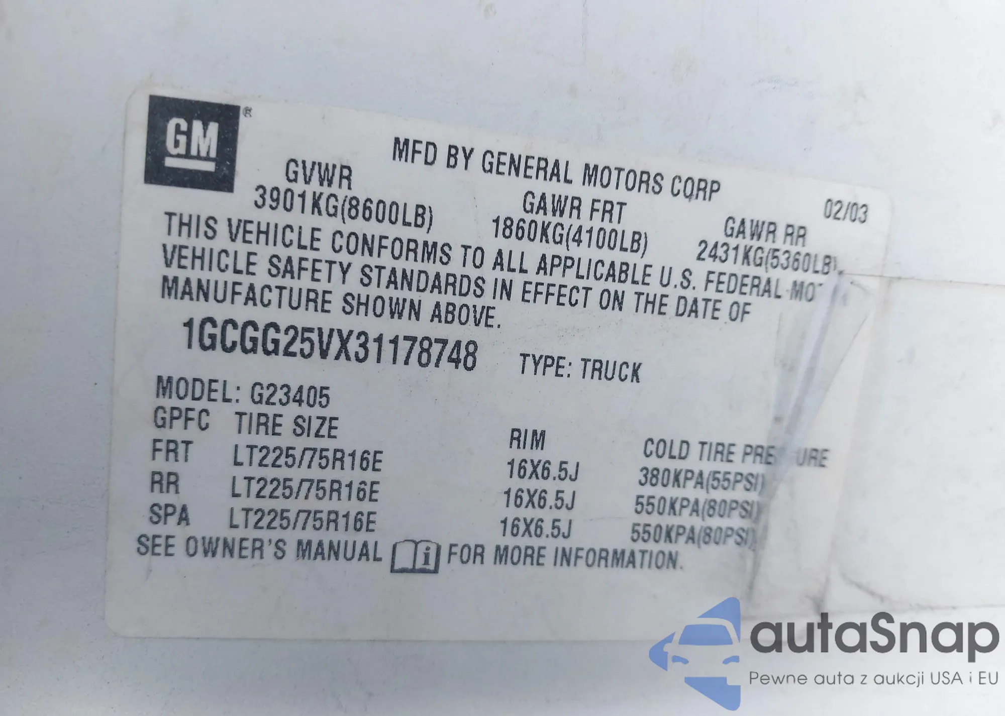 • VIN 1GCGG25VX31178748