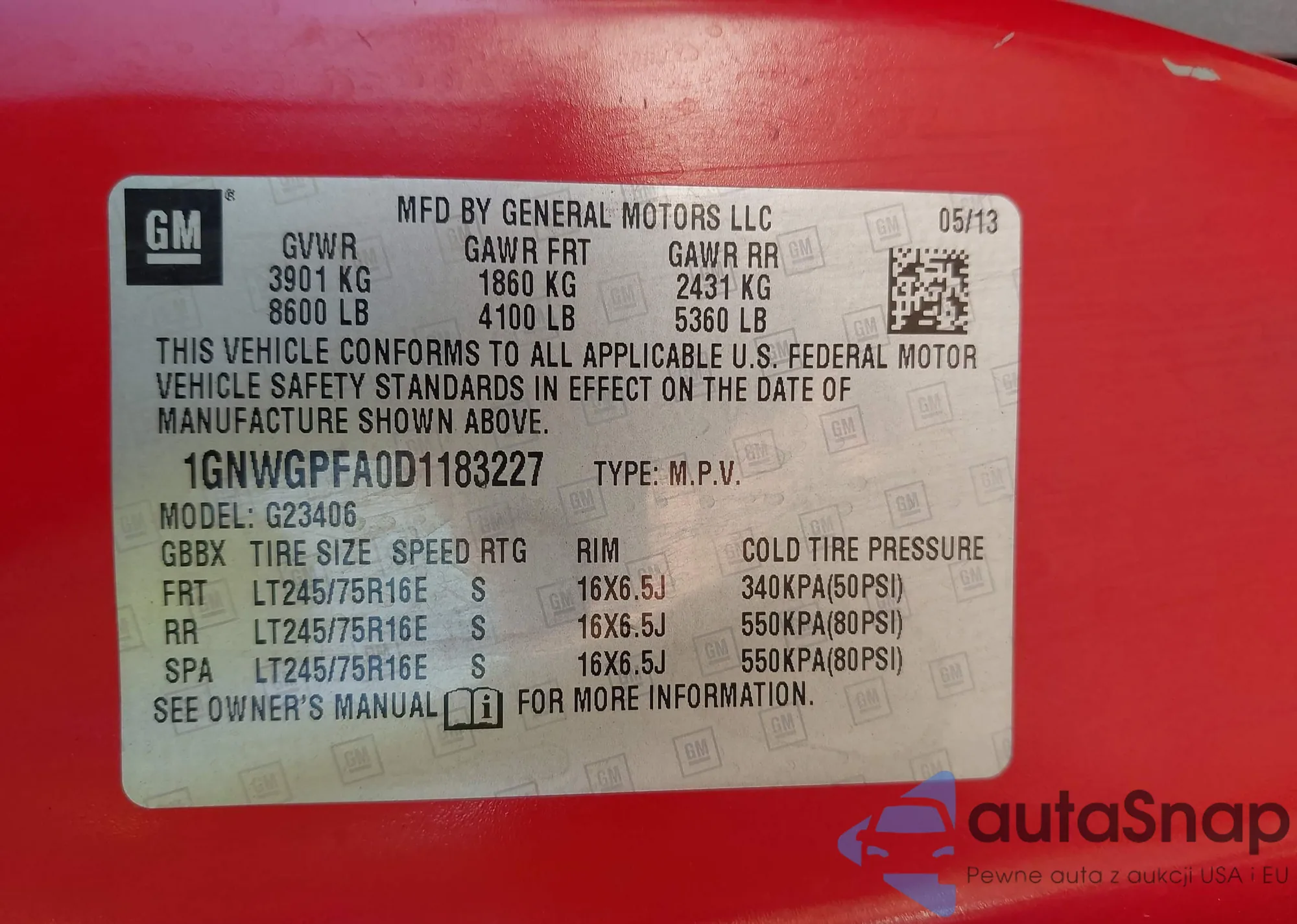 LOT: 43884105 VIN: 1GNWGPFA0D1183227