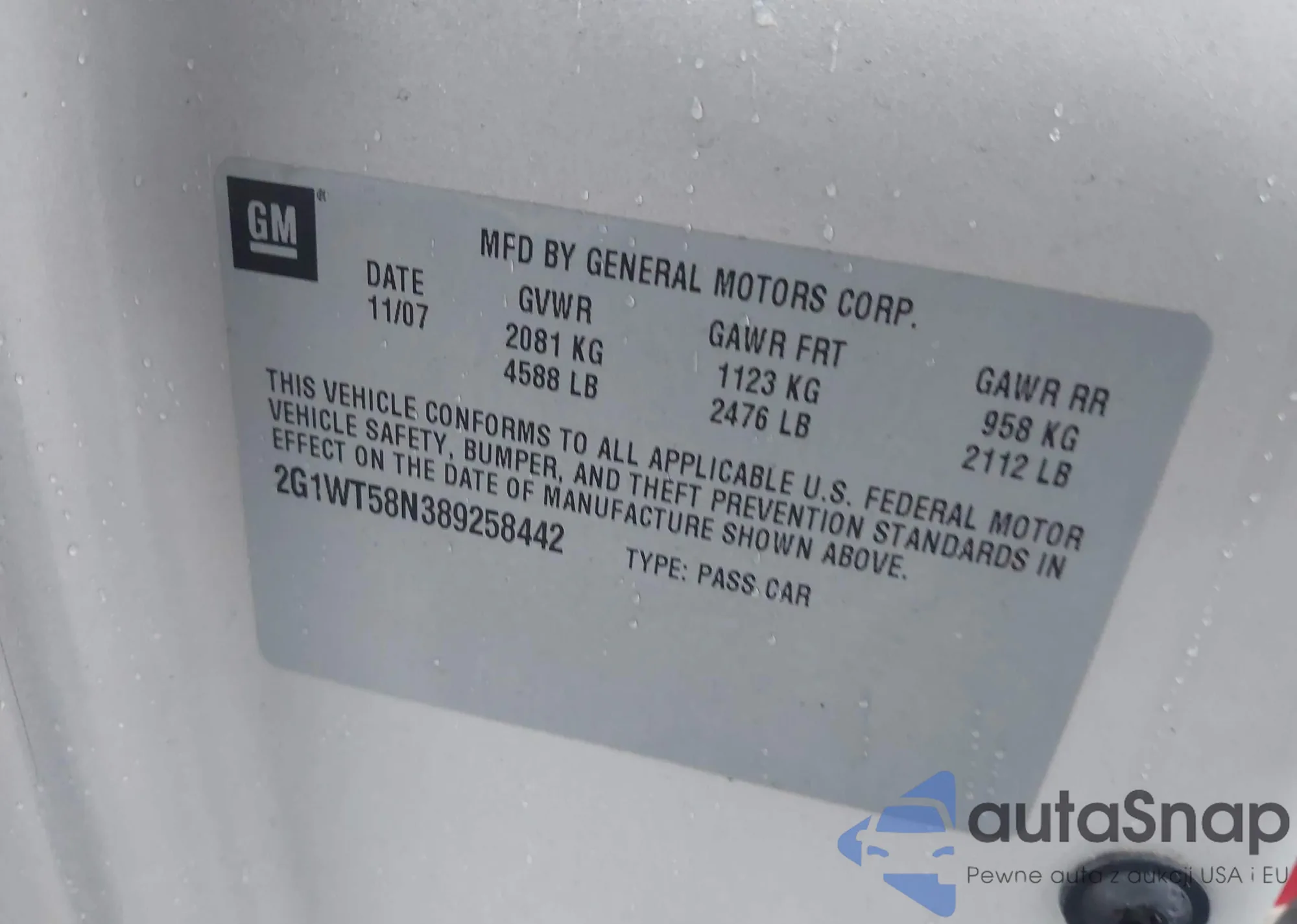 • VIN 2G1WT58N389258442