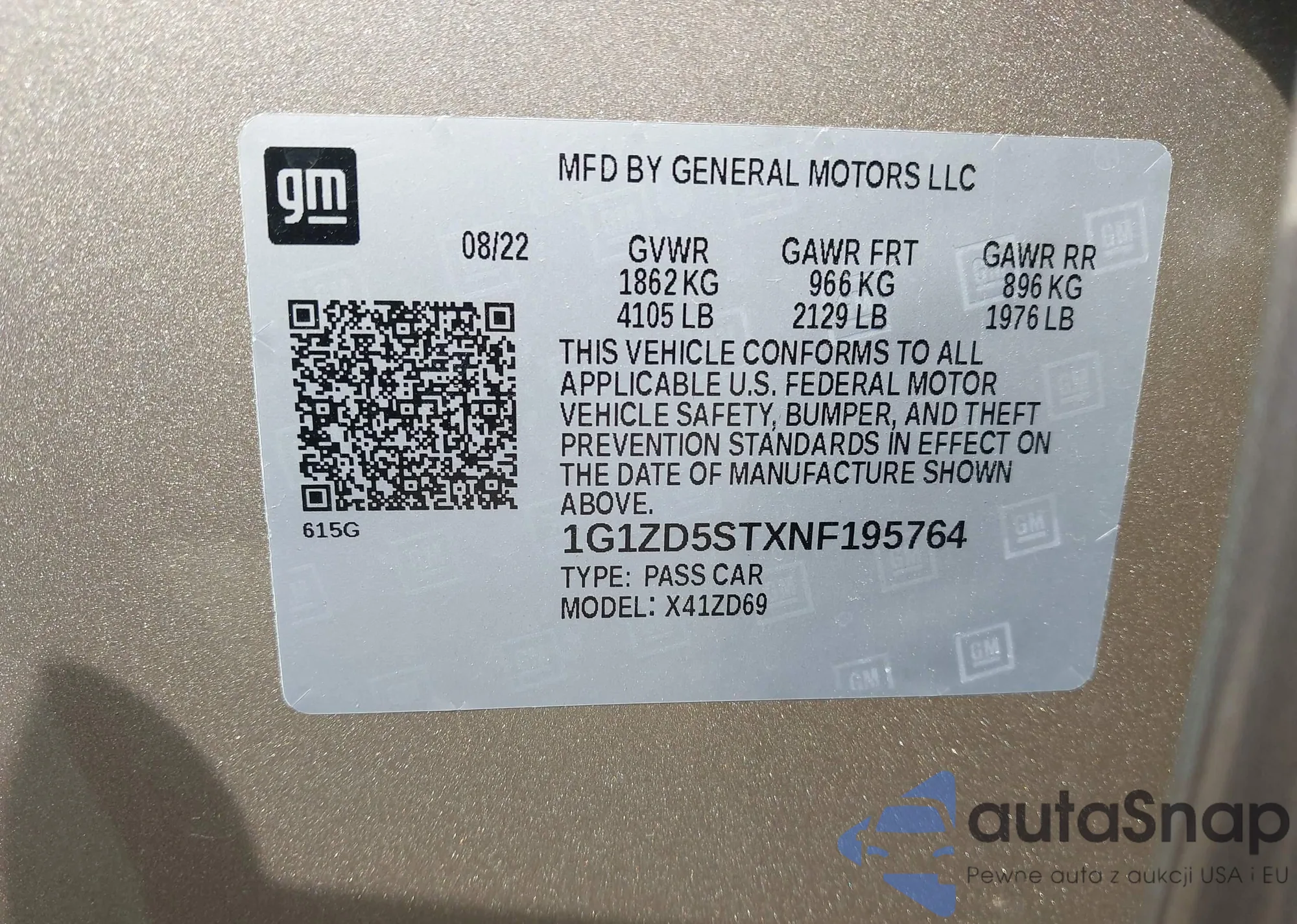 LOT: 43286132 VIN: 1G1ZD5STXNF195764