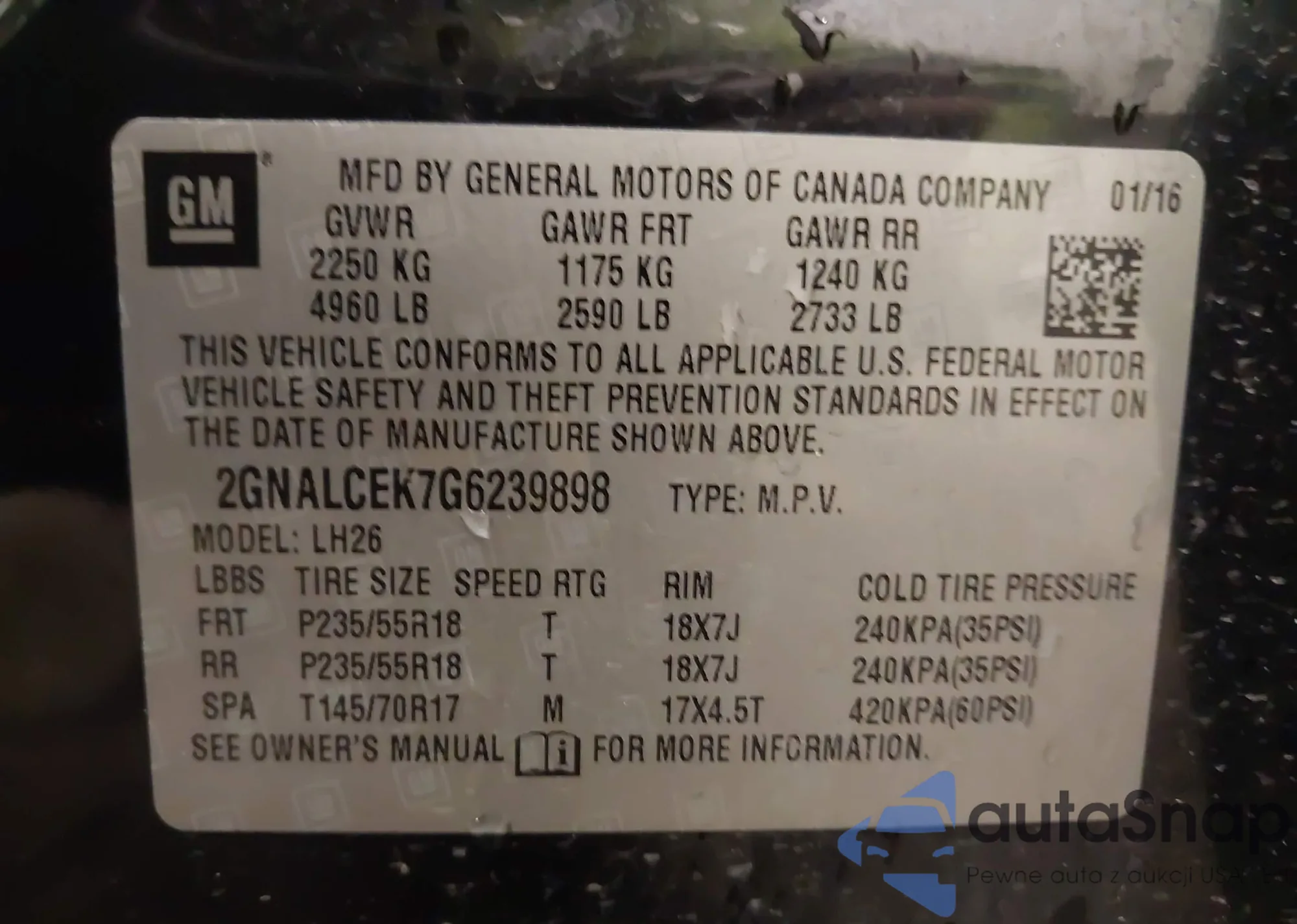 LOT: 44192208 VIN: 2GNALCEK7G6239898