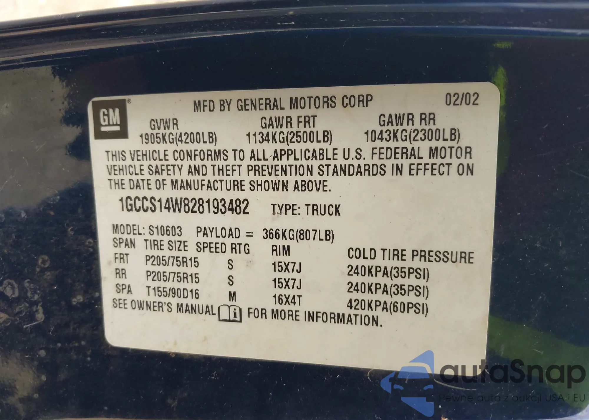 • VIN 1GCCS14W828193482