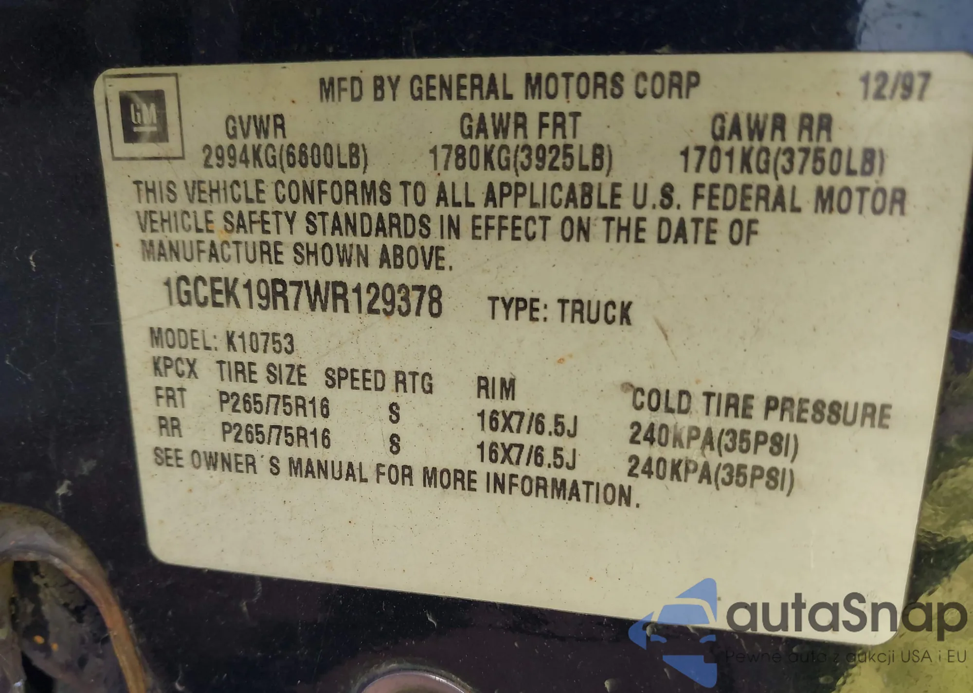 LOT: 43965354 VIN: 1GCEK19R7WR129378
